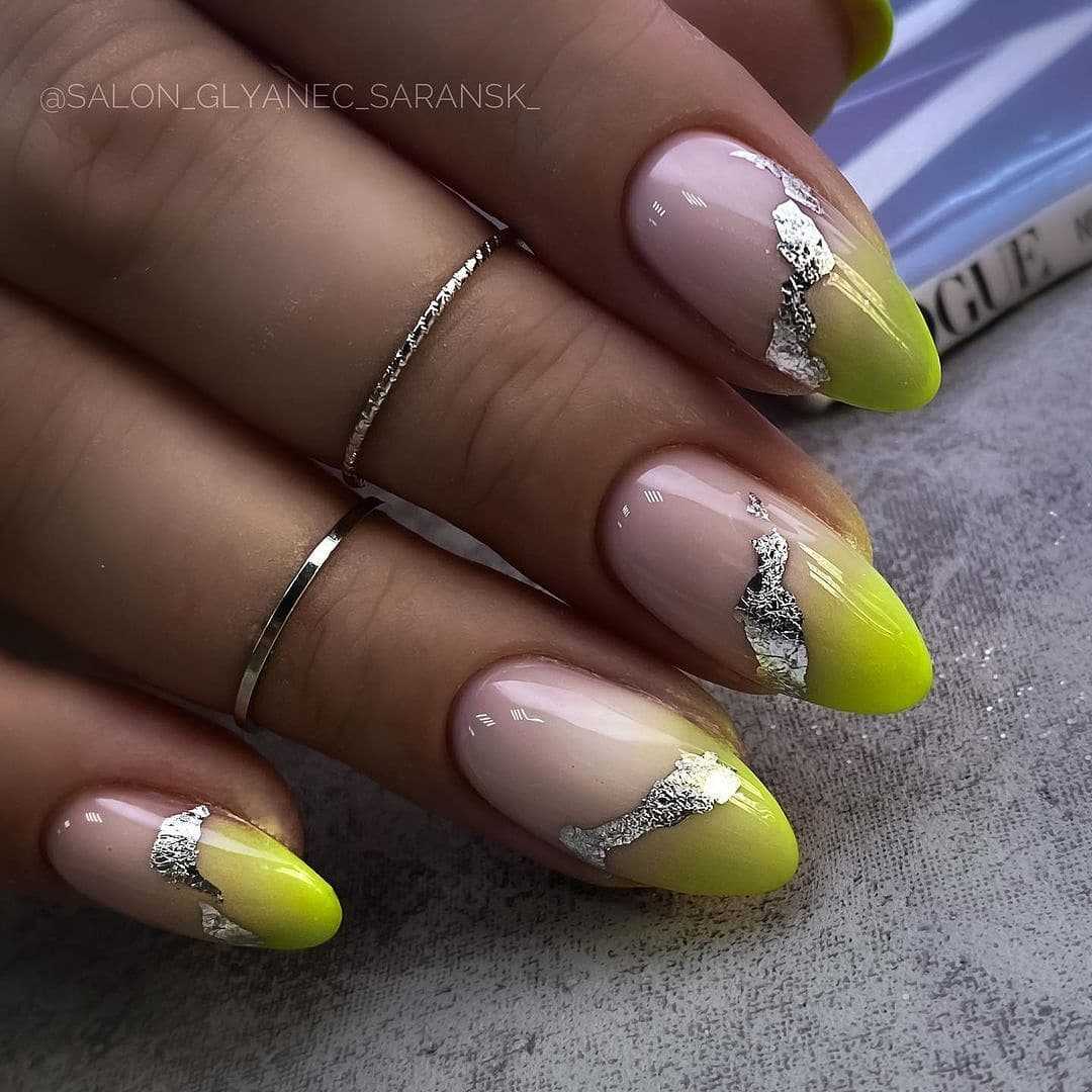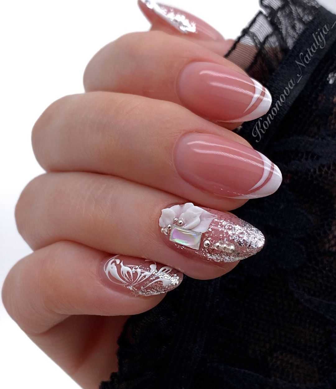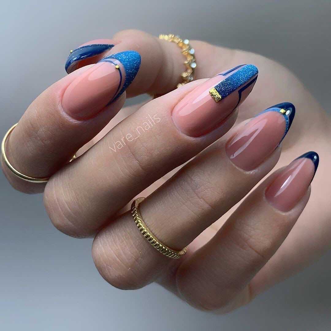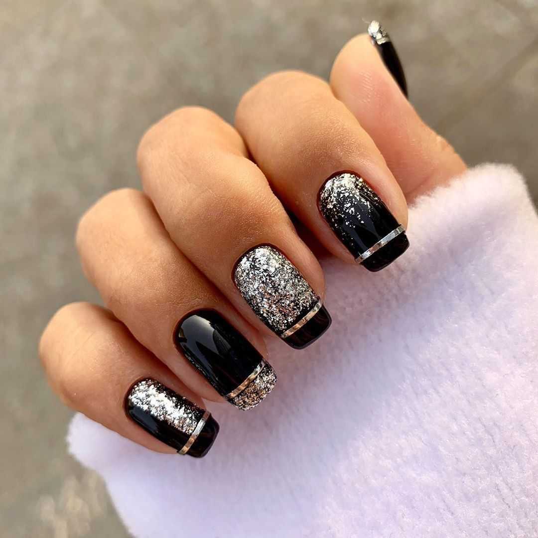 Некоторые ногти в таком маникюре можно полностью покрыть выбранным сверкающим материалом. Чтобы оттенить блеск и избежать слишком броского впечатления от дизайна, мастера предлагают один-два ногтя покрыть нюдовым оттенком. Такой нейл-арт будет невероятно стильным. Его можно включать не только в праздничные наряды, но и в офисные, повседневные луки.