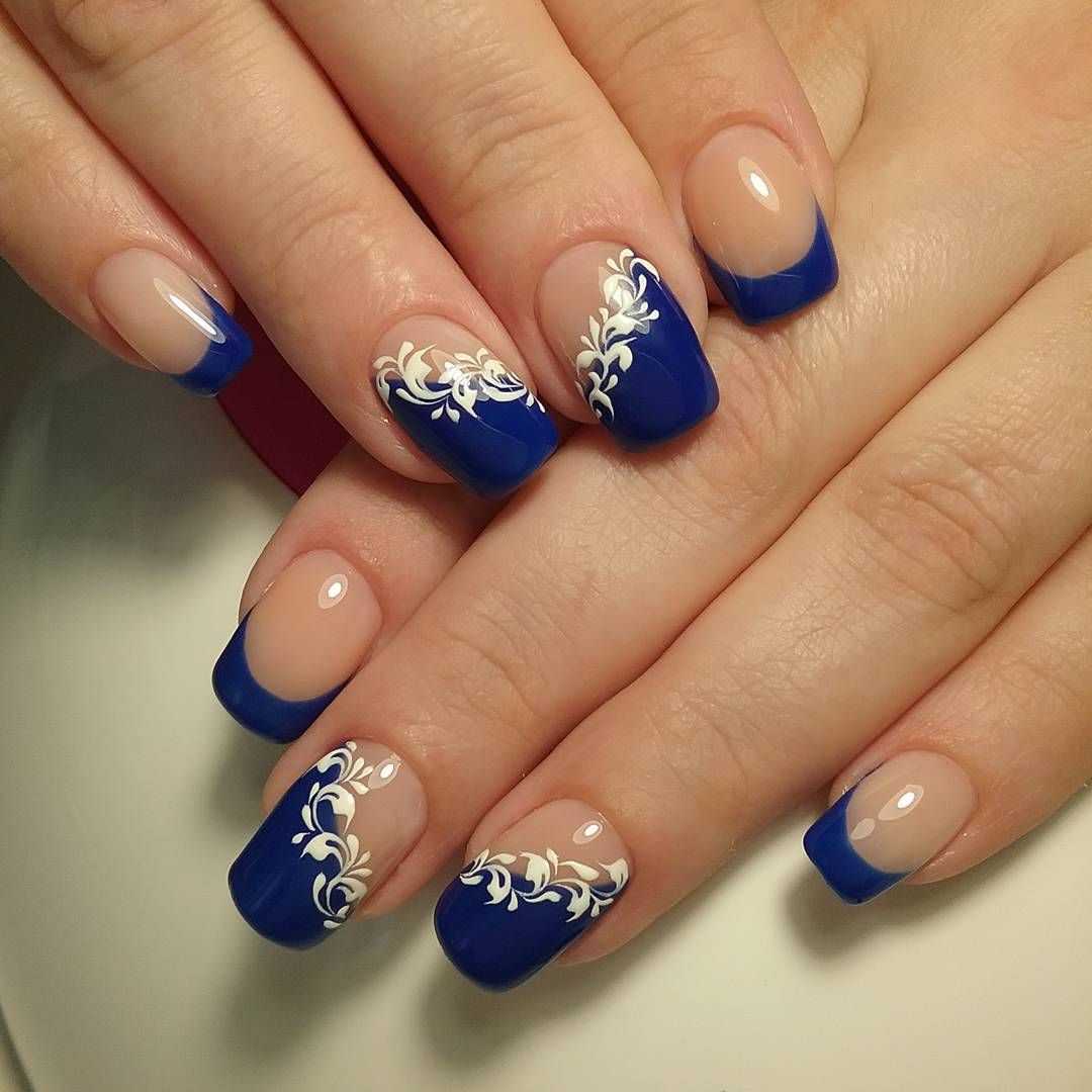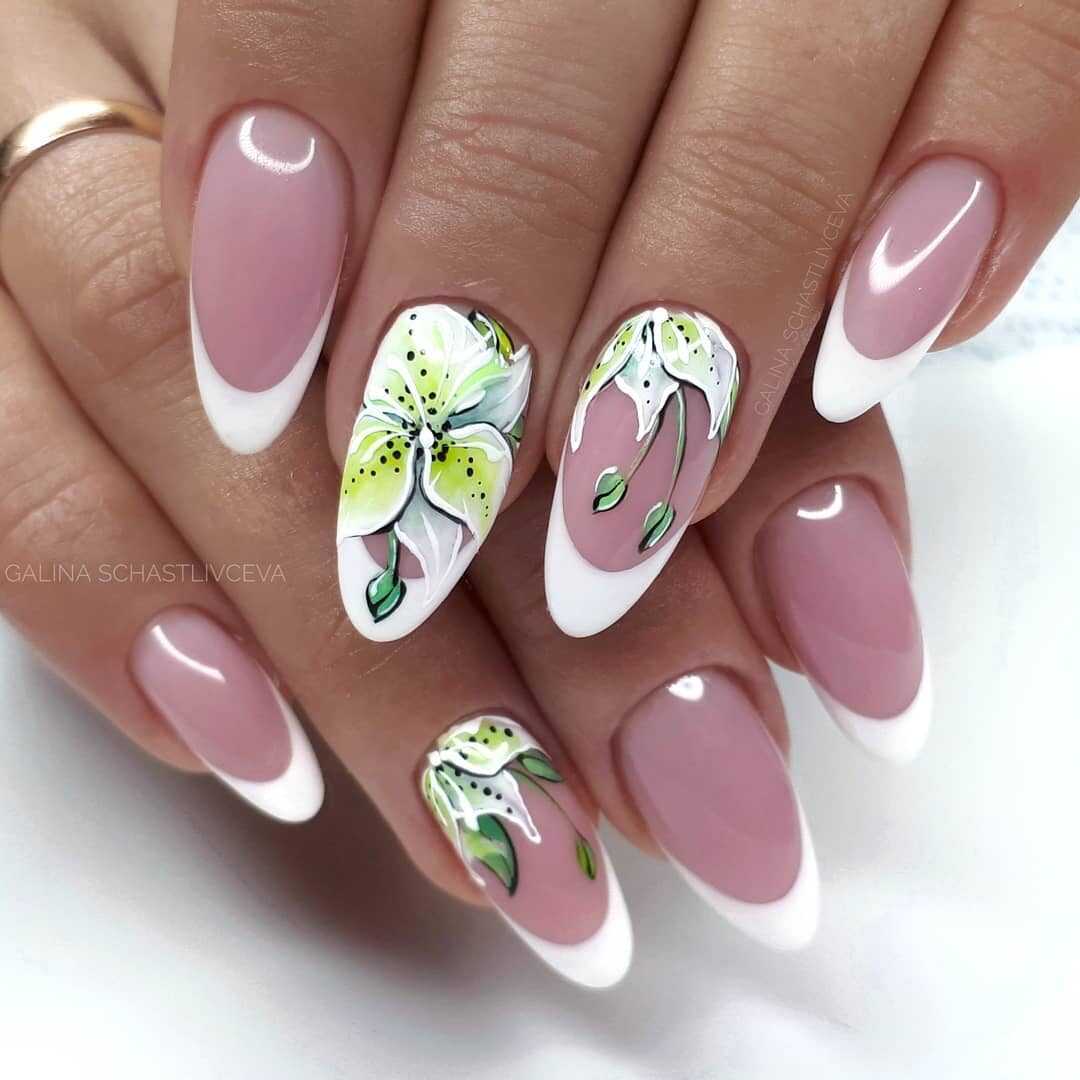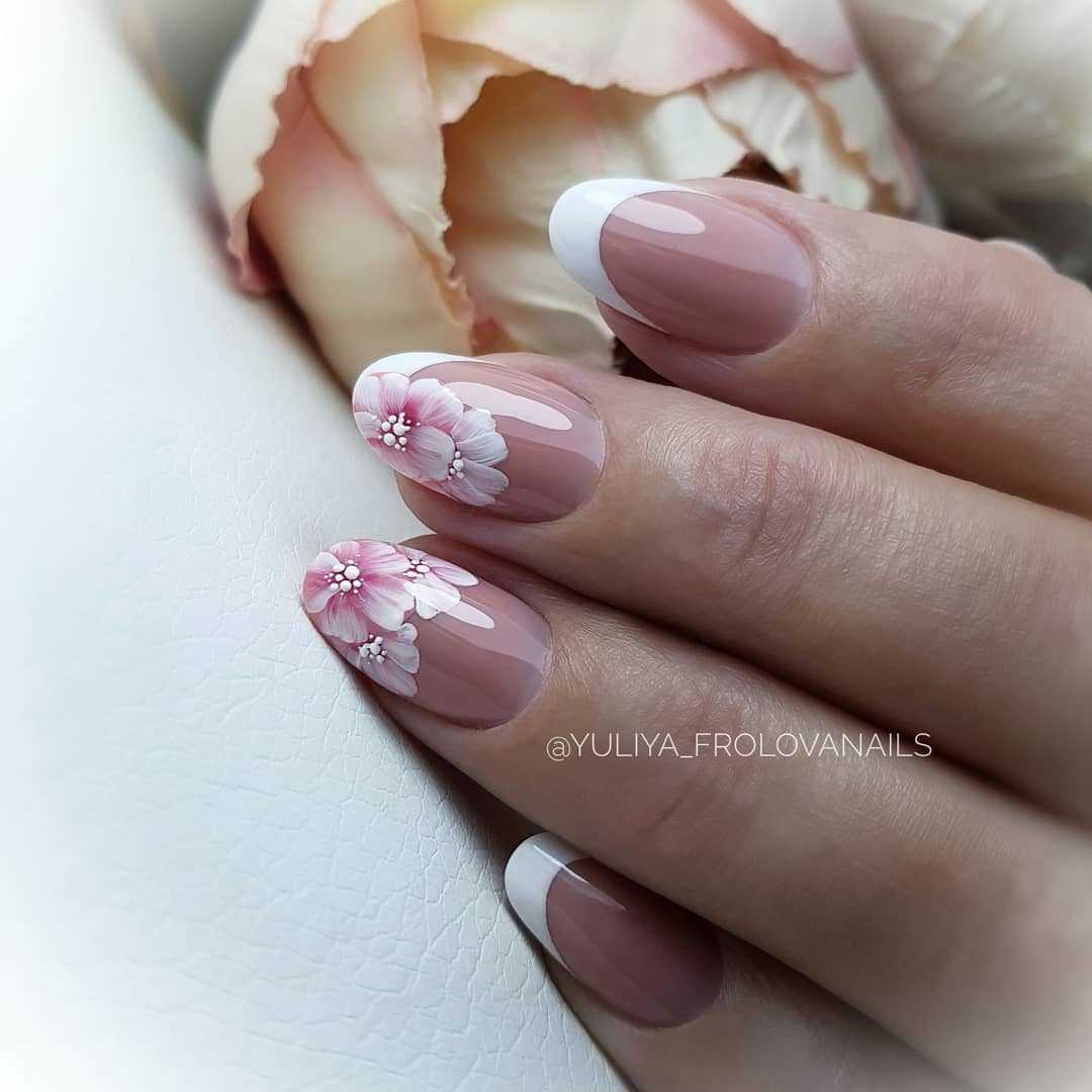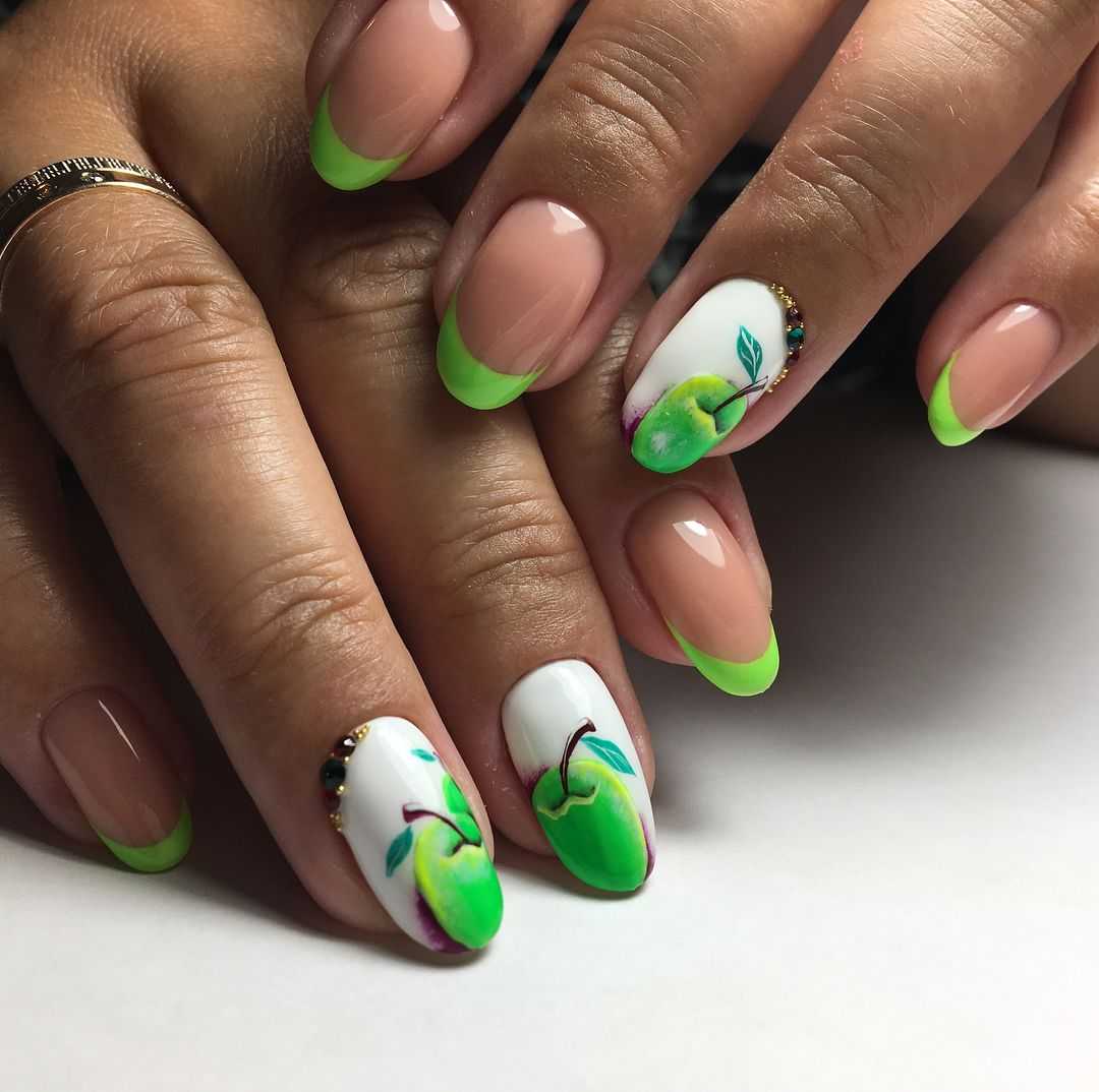 Еще одна модная тенденция, которая будет актуальной в 2021 году. Рисунки на ногтях в маникюре френч могут быть самыми разными: в виде цветочных мотивов, надписей, изображений фруктов и оригинальных орнаментов.
