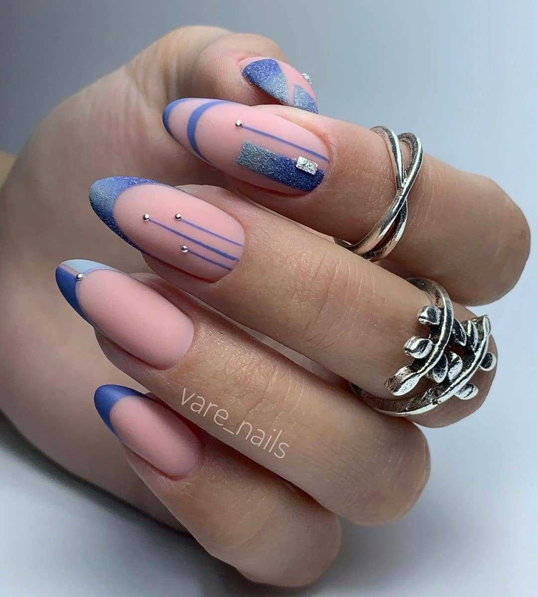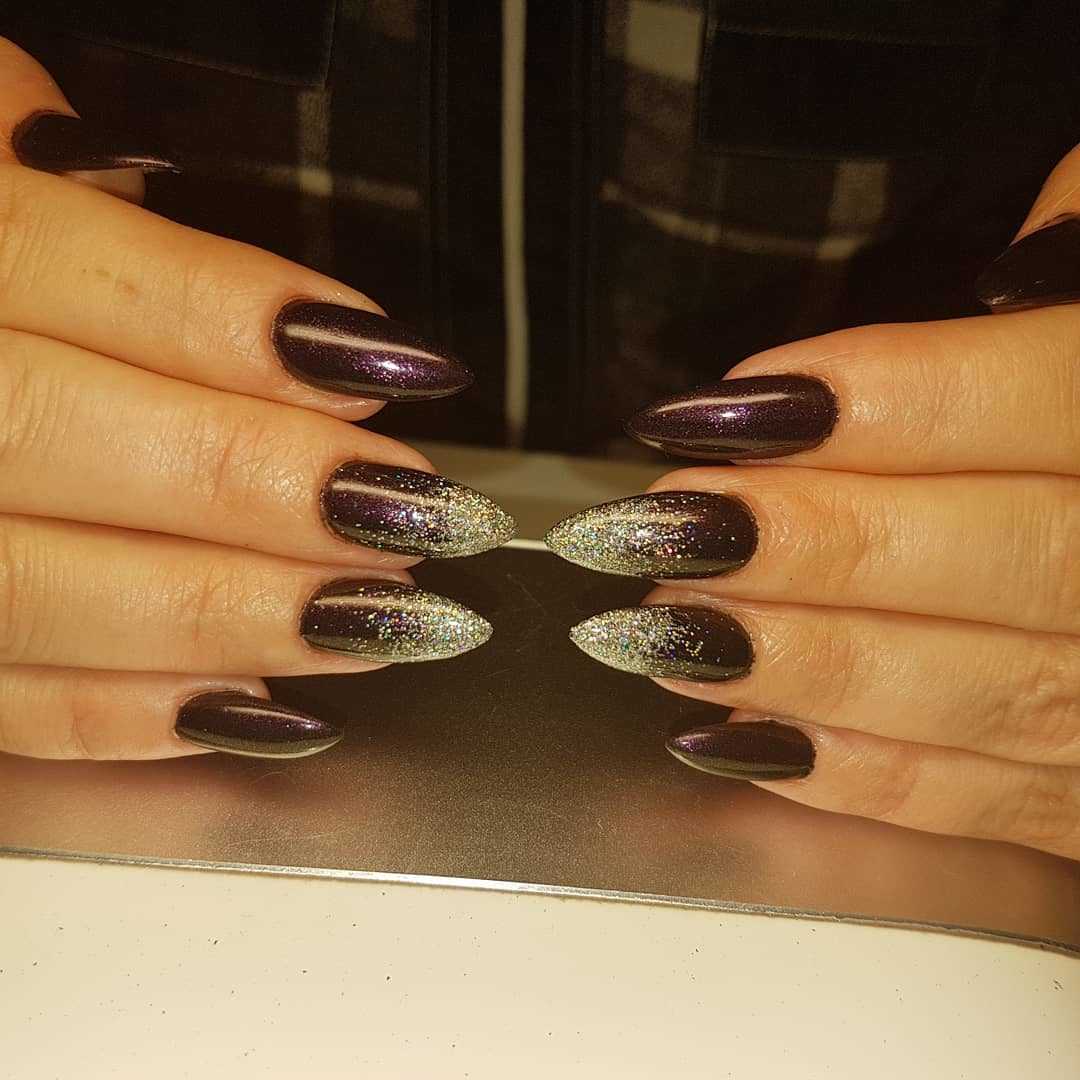 - На самом деле они будут в тренде, но применяться точечно или небольшими участками. В основном блестки будут использоваться в виде прорисовок, растяжки от конца или лунулы, или на участках, при выполнении геометрии.