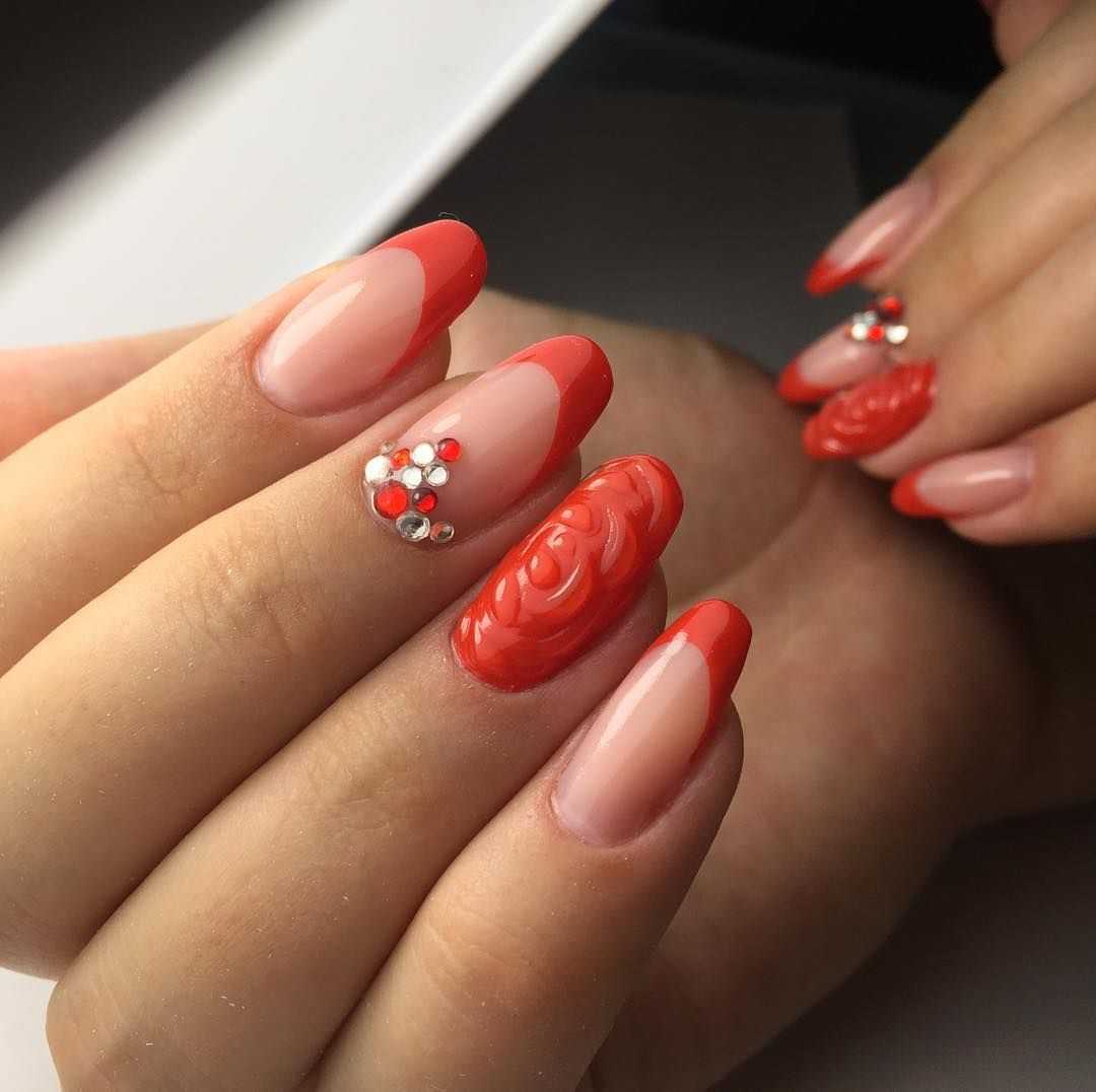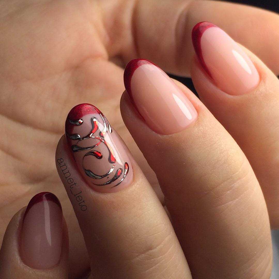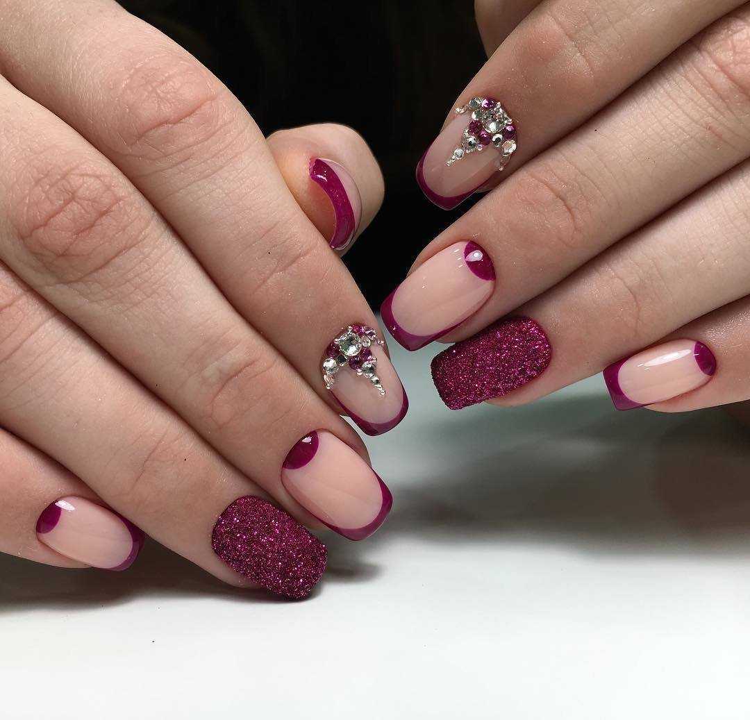 Французский. В таком маникюре темно-красным цветом окрашивают верхнюю часть ногтя, а остальное можно задекорировать, к примеру, стразами.