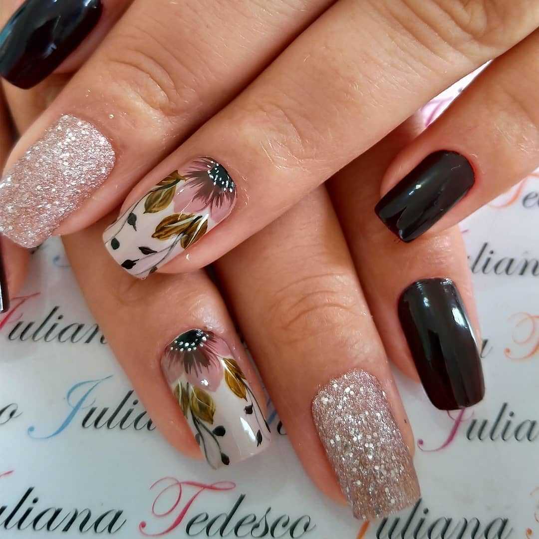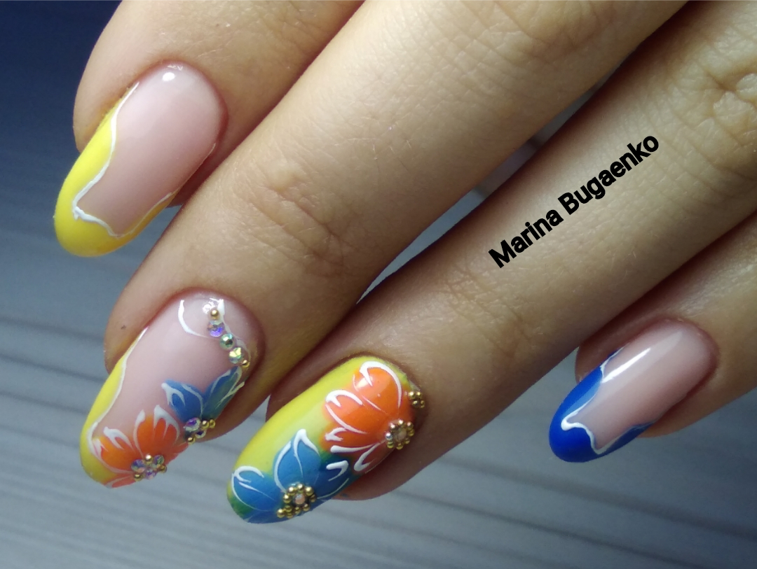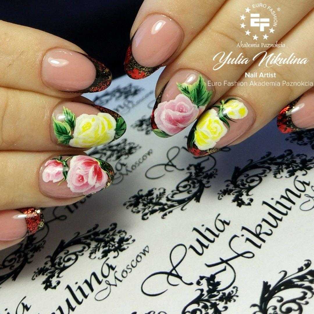 С цветами. Цвета для растительных мотивов можно выбрать совершенно разные, главное чтобы они сочетались с нашим оттенком. С размерами узора тоже стоит поэкспериментировать: изобразить в виде небольших соцветий или одного большого бутона. Такие цветы могут быть нанесены лаком, акриловой краской, либо при помощи наклеек.