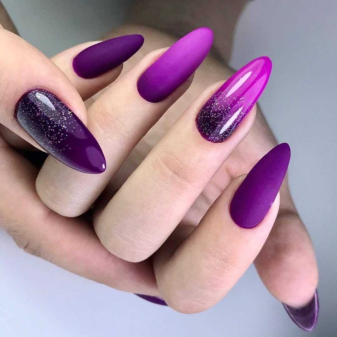 Чтобы получить стильный дизайн, на овальные ногти можно сделать лунный нейл-арт с матовым финишем. Лунку оставьте «голой» или заполните глиттером. В сочетании с матовой поверхностью блестящие островки выглядят особенно интересно. Самые популярные оттенки: светло-серый, пудровый, нюдовый, сиреневый.