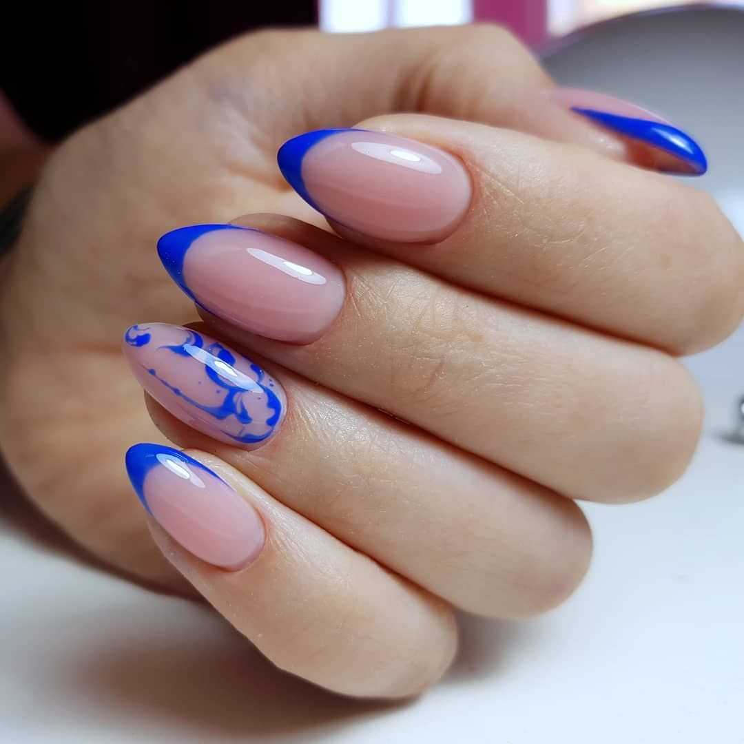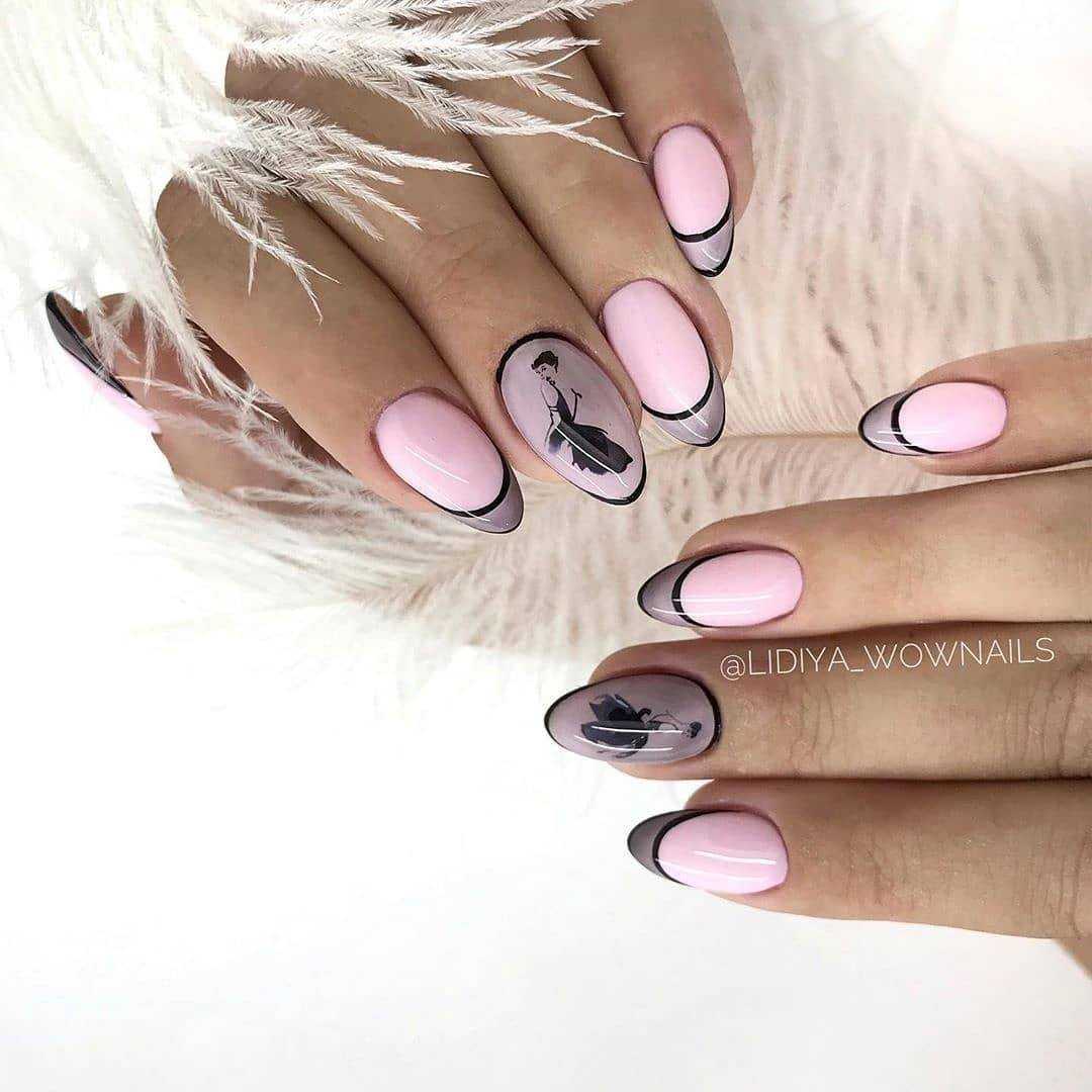 Овальные ноготки женственные и нежные. Для них подходит аккуратный тонкий френч с романтичным дизайном. Форма улыбки может быть любой. Если ногти длинные выбирайте любой декор и придумывайте любой дизайн. Ведь тренд 2022 года- индивидуальность и уникальность.