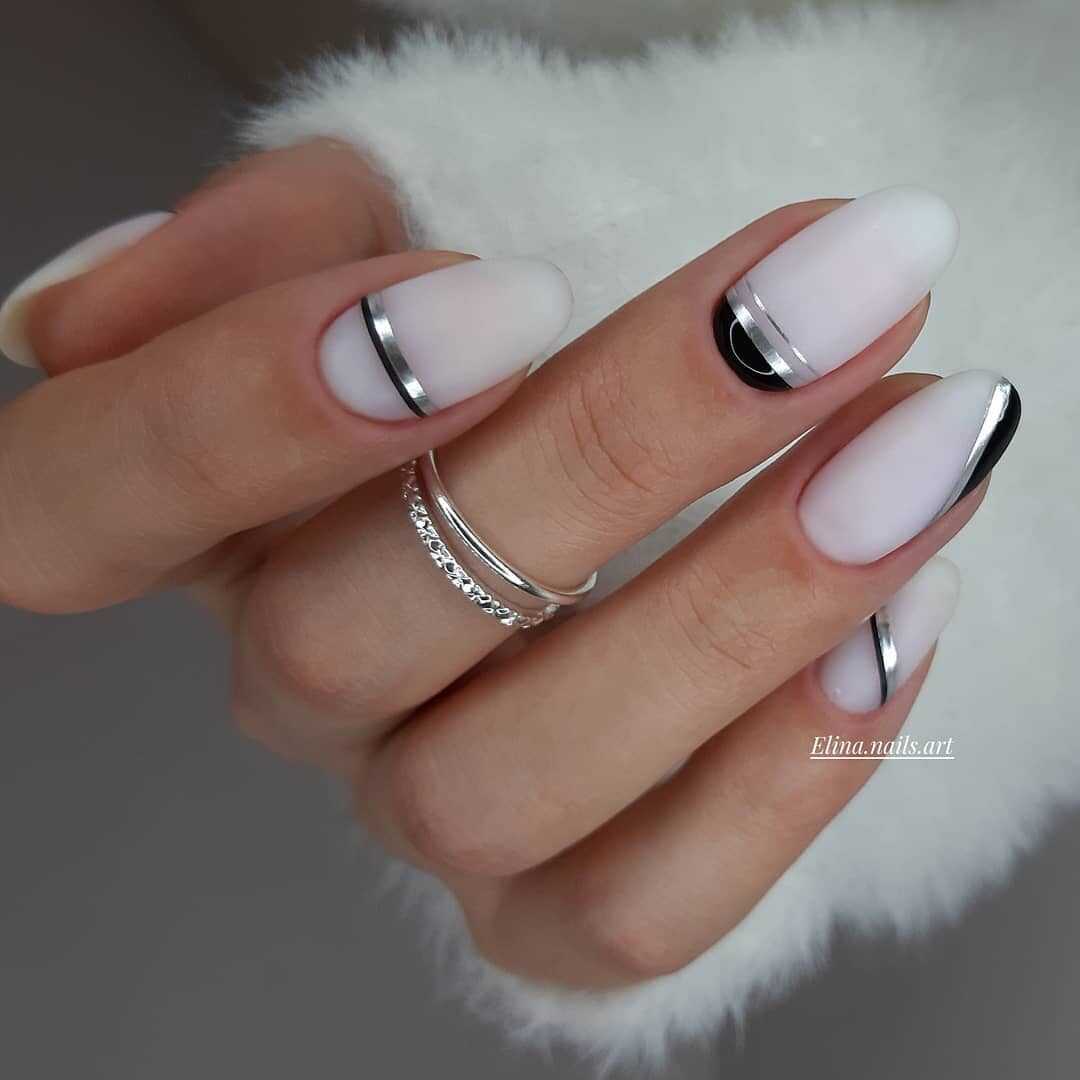 Главное, что такой дизайн не нуждается в дополнении – достаточно будет нанести идеально ровную переливающуюся полоску на ногтевой пластине. Готовый маникюр уж точно не будет выглядеть скучно.