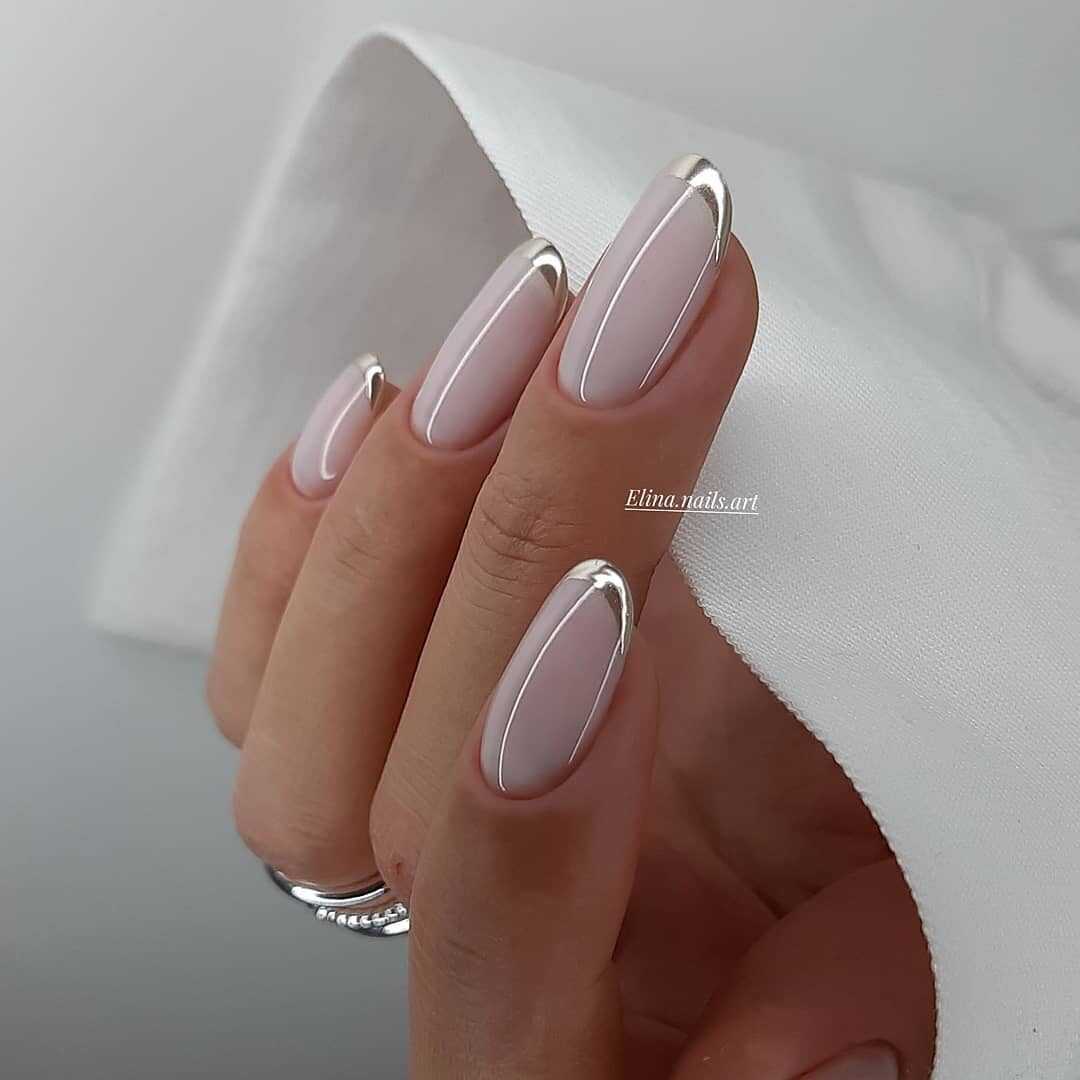 Очень модно и необычно будет выглядеть французский маникюр с использованием серебристых или золотистых оттенков. Такой дизайн смотрится очень сдержанно и в то же время модно и нарядно.