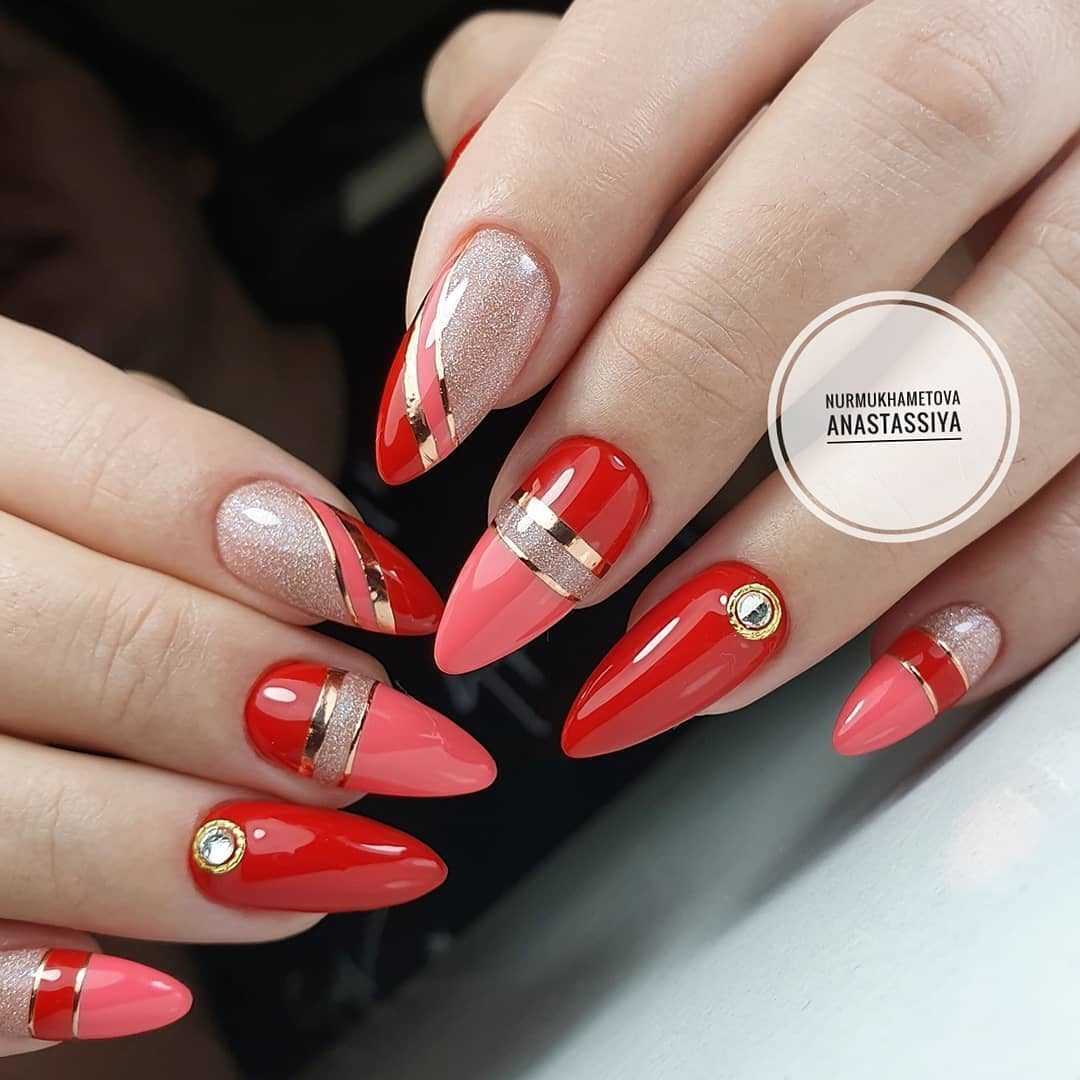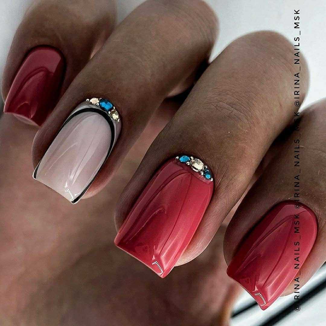 Сезонный. В зависимости от времени года, можно использовать либо теплые, либо холодные оттенки темно-красного. К примеру, глубокий однотонный красный в сочетании с винным станет отличным вариантом для осеннего маникюра. Эту идею можно дополнить, разбавив однотонность золотыми блестками.