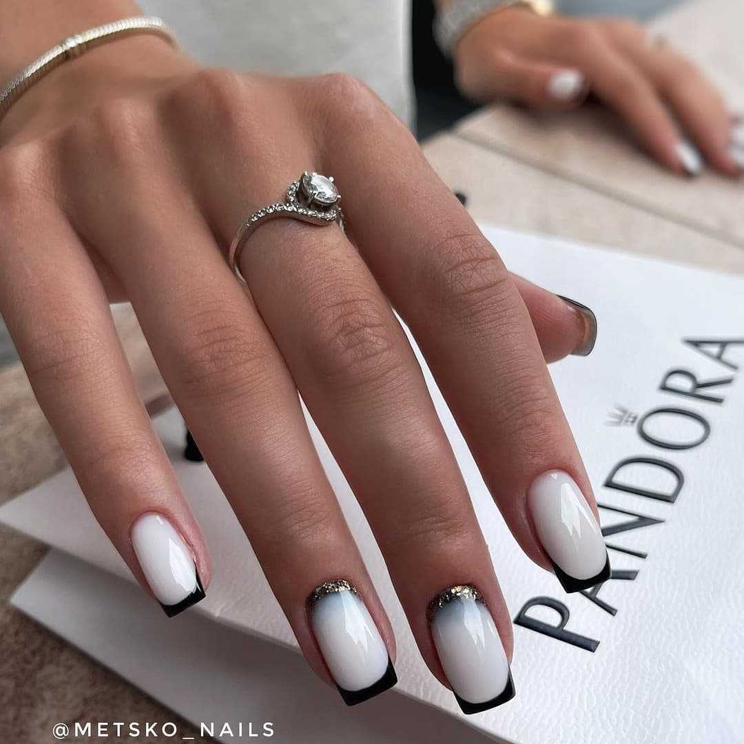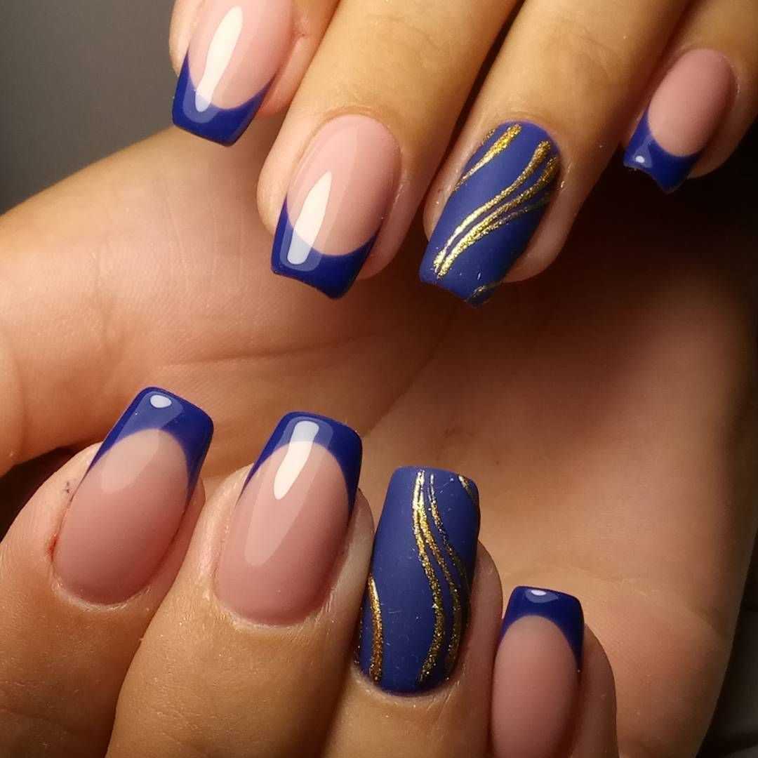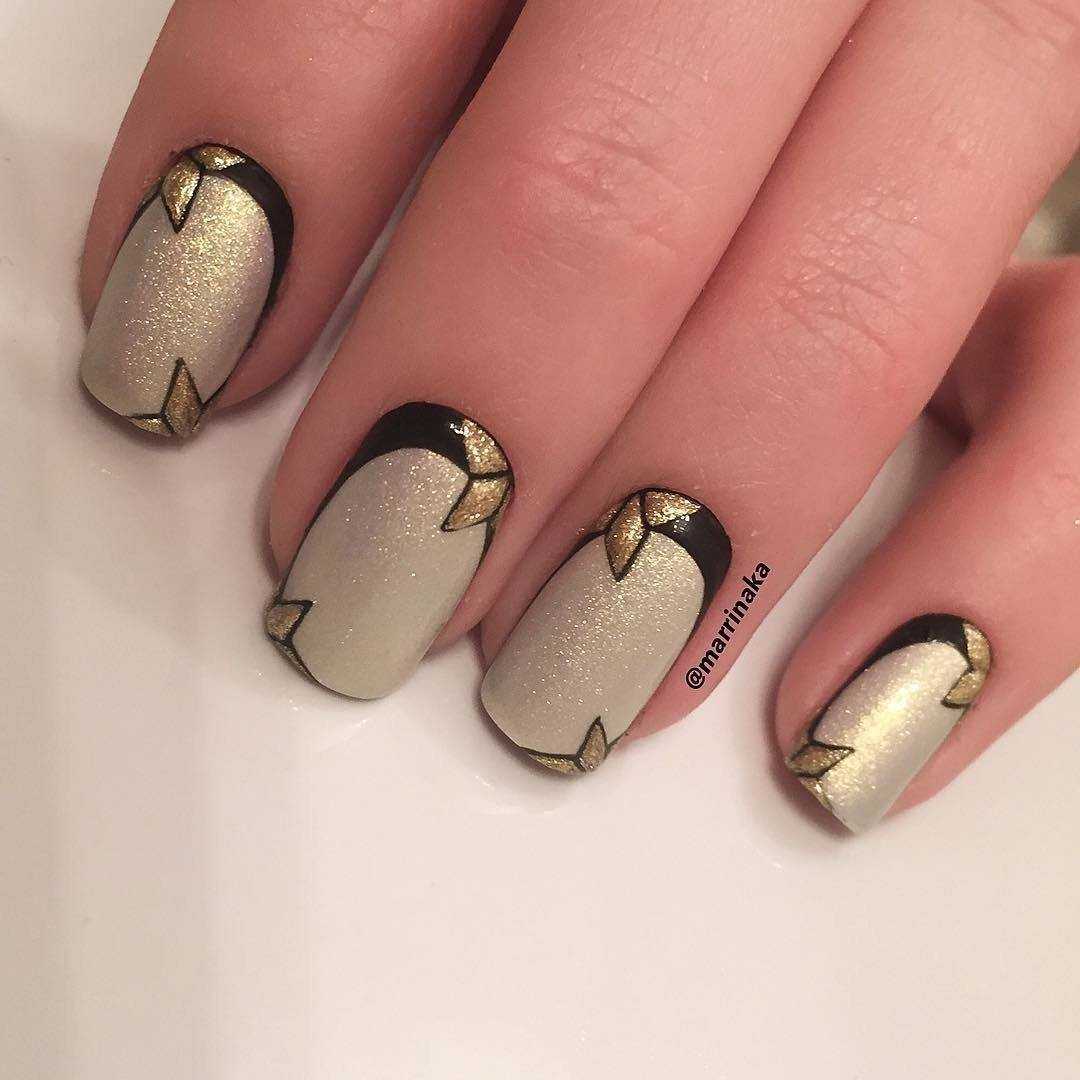 - Праздничный френч 2022 с черной основой и золотым (лак, фольга) свободным крем ногтя. Любая матовая основа и краешек цвета «хромированный металлик». Это сочетание выбирают и для ногтевого пирсинга, любительницам всего экстравагантного.