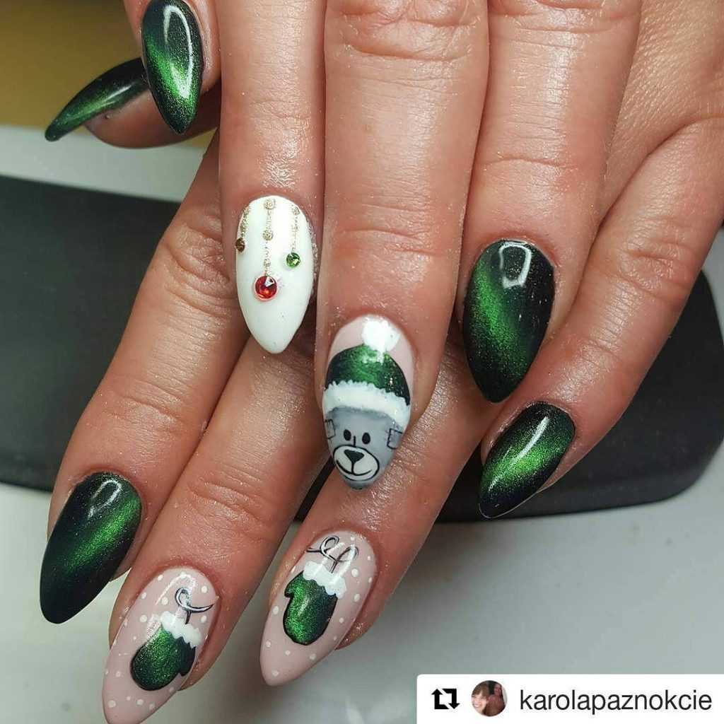 Эффектный маникюр, похожий на камень “кошачий глаз” в сочетании с классическими атрибутами Нового года – снежинками, елочными игрушками, шапочками Деда Мороза, варежками и знаками Задиака, создаст особое зимнее праздничное настроение.