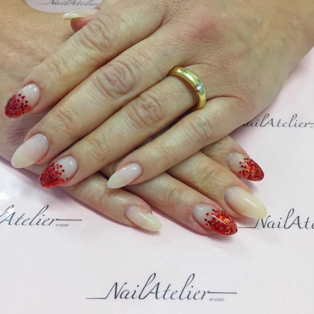 • художественный нейл-арт – куда же в зимнюю сказку без снежинок? Маникюр с рисунком в виде снежной узорчатой завесы совершенно не новшество, но он никогда не оставит своих лидирующих позиций зимнего периода, потому как ничто так стилистически выраженно не проявит новогоднего зимнего волшебного настроения. Ведь не всегда погода радует снежными осадками в самый ответственный момент, поэтому, хотя бы на ногтях девушки желают созерцать снежную пелену красоты. При этом за основу может быть взят совершенно любого цвета гель-лак или шеллак, белые снежинки на тёмном фоне или тёмного цвета снежинки на светлом полотне всегда выглядят тематически и довольно выразительно;• текстурная кладь – активно популяризуется в современном обществе матовая поверхность основы и воссозданные поверх неё текстуры в виде различного рода орнаментов и выбоин. В новогодней стилистике ценится выкладка из плетения объёмной косы в тон основному покрытию или же орнаментный рисунок в новогодней стилистике с выделением ноготка одного из пальчиков изображением оленя-скакуна, предвестника новогоднего визита дедушки мороза;• блестящая втирка – не обходится ни одно рождественское празднество без мерцания красочных блёсток в виде глиттера или шиммера, которыми усеивается отдельно прикорневая зона ноготка или растушёвывается линия ногтевого среза
