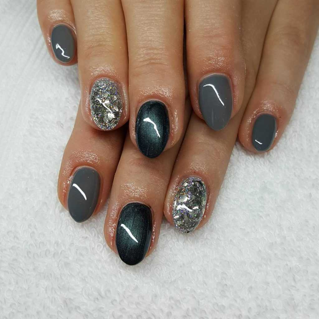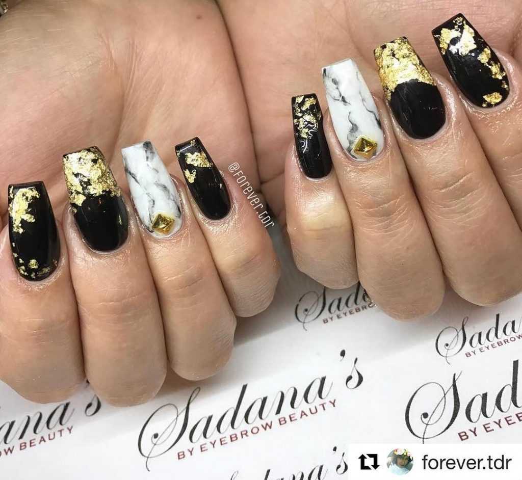 Блестки, золотая фольга и глиттер – отличное обрамление для праздничных ноготков. В сочетании с холодным спектром лака металлик Вы получите маникюр в стиле “деловая роскошь”, а в сочетании с мраморным или леопардовым орнаментом – дизайн для гламурной вечеринки.