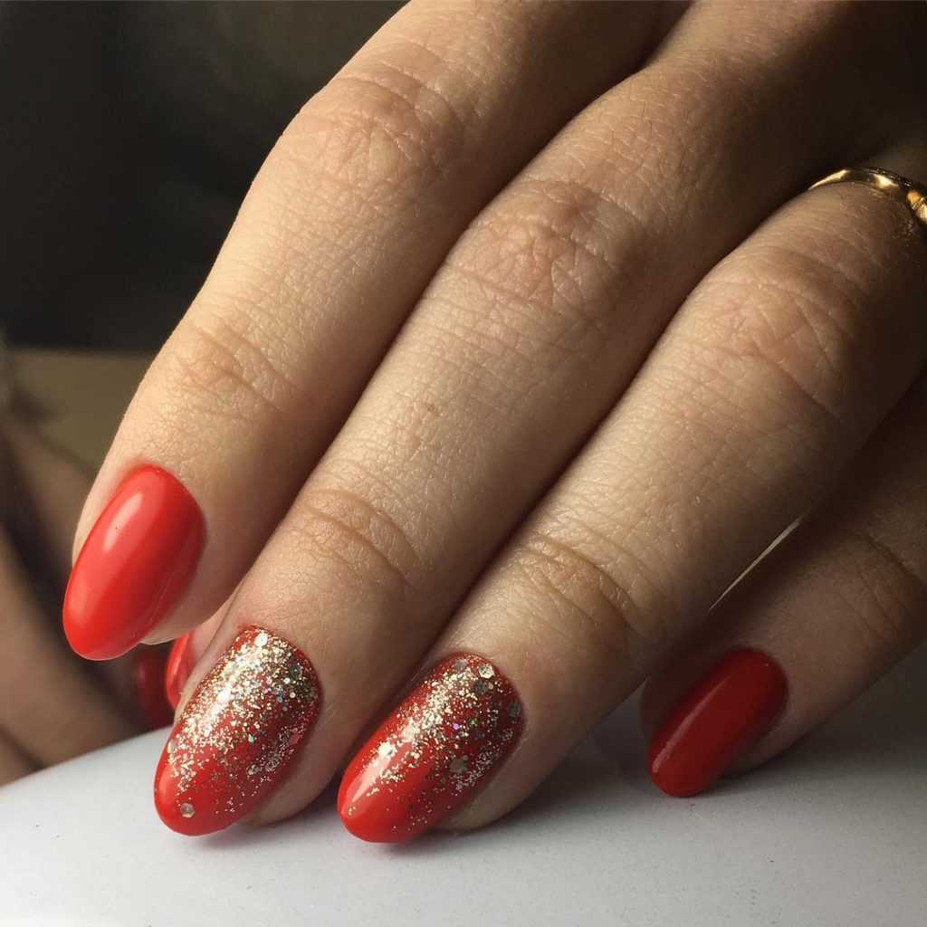 Не теряет своей оригинальности и изящности вариант маникюра, где золотом выделено всего пару пальчиков на руке. При помощи красного цвета и золота можно визуально удлинить ноготь, сделать маникюр более праздничным или строгим. Главное – правильно выбрать маникюр и все сделать аккуратно.