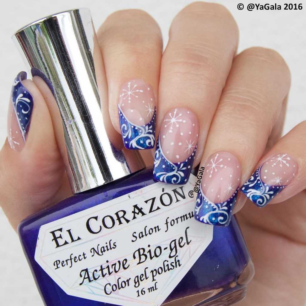 Дополнить французскую композицию можно методикой декорирования одного пальчика орнаментной росписью, воплощающей морозный орнамент.