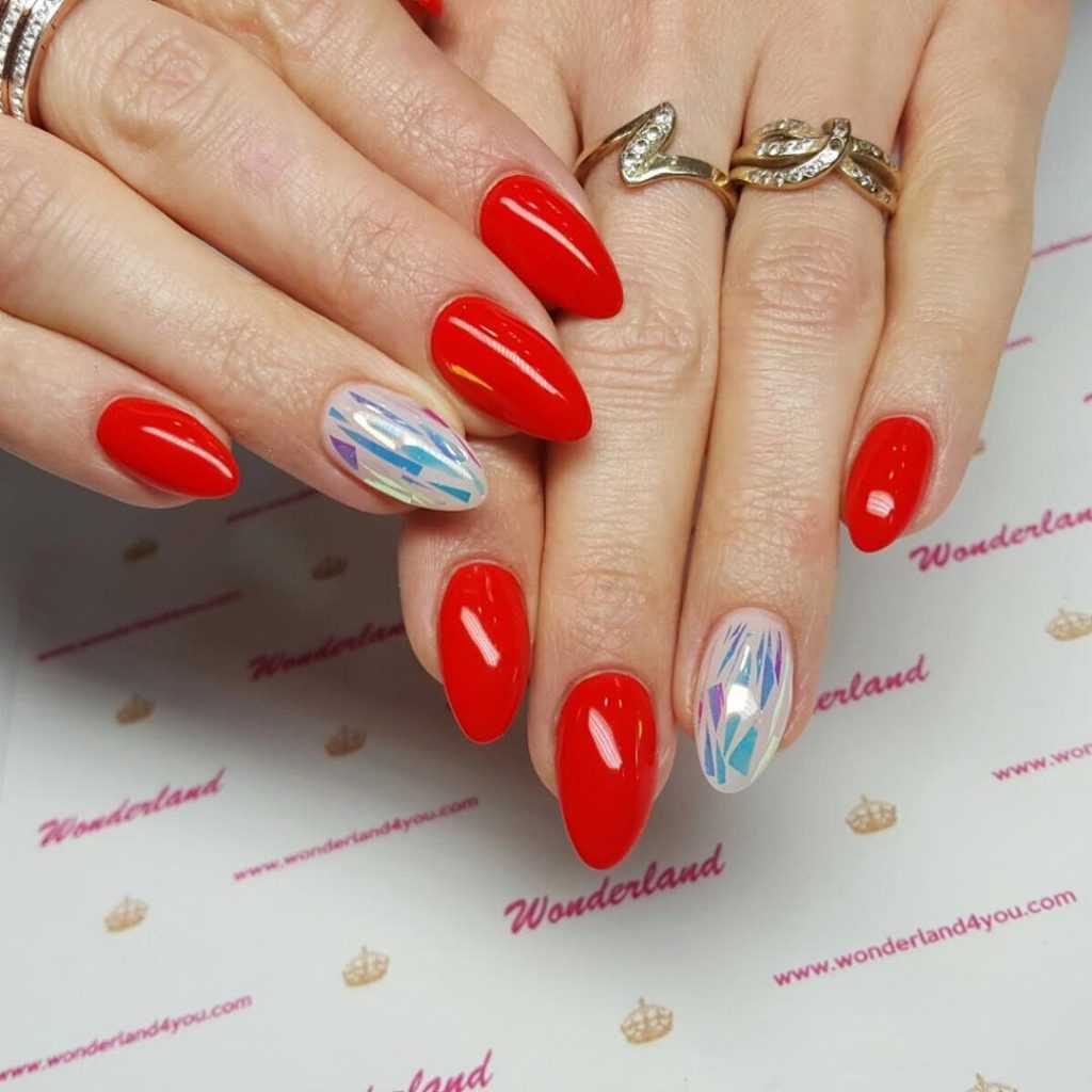 Красный в сочетании с золотом всегда красиво и эффектно смотрится на ногтях любой формы и длины. К тому же, это выглядит всегда богато, маникюр отличается изысканностью. Для декора в таком тоне можно использовать как наклейки, так и золотистую присыпку или лак, фольгу. Особо ярко он будет сиять в солнечный день.