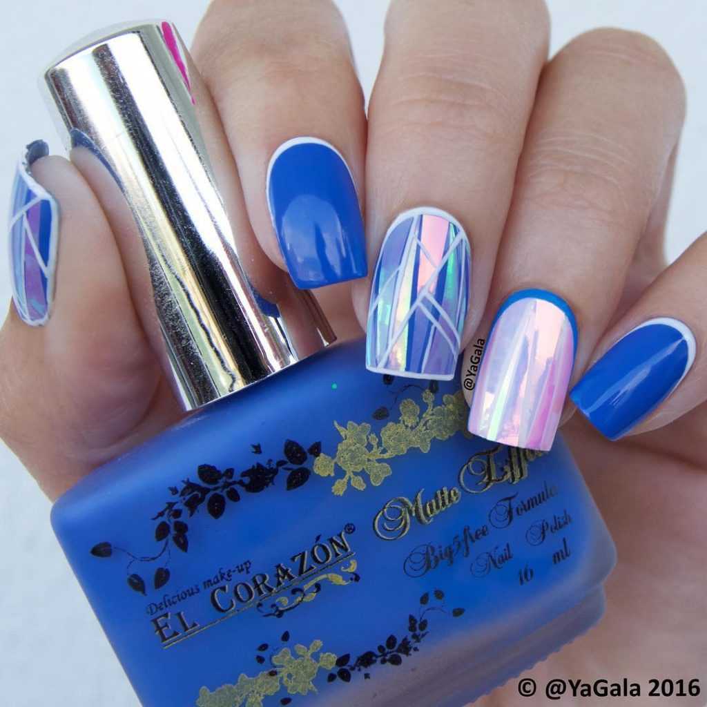Модный сейчас маникюр в стиле битого стекла сделать совсем не сложно, понадобится только голографическая пленка, пара цветных и прозрачный лак для покрытия. Поэтому мы смело можем рекомендовать этот простой дизайн всем, кто хочет получить великолепный новогодний маникюр в домашних условиях.