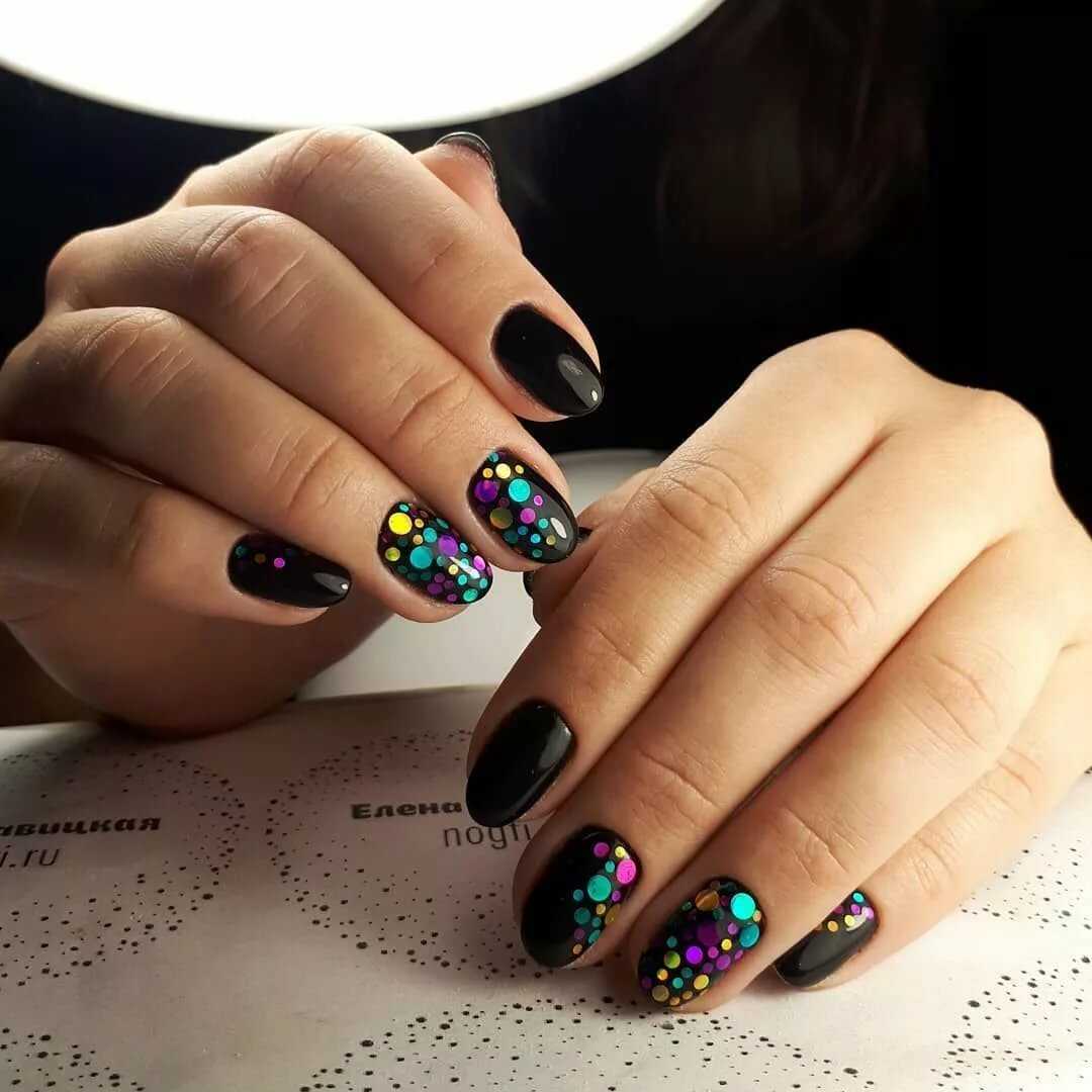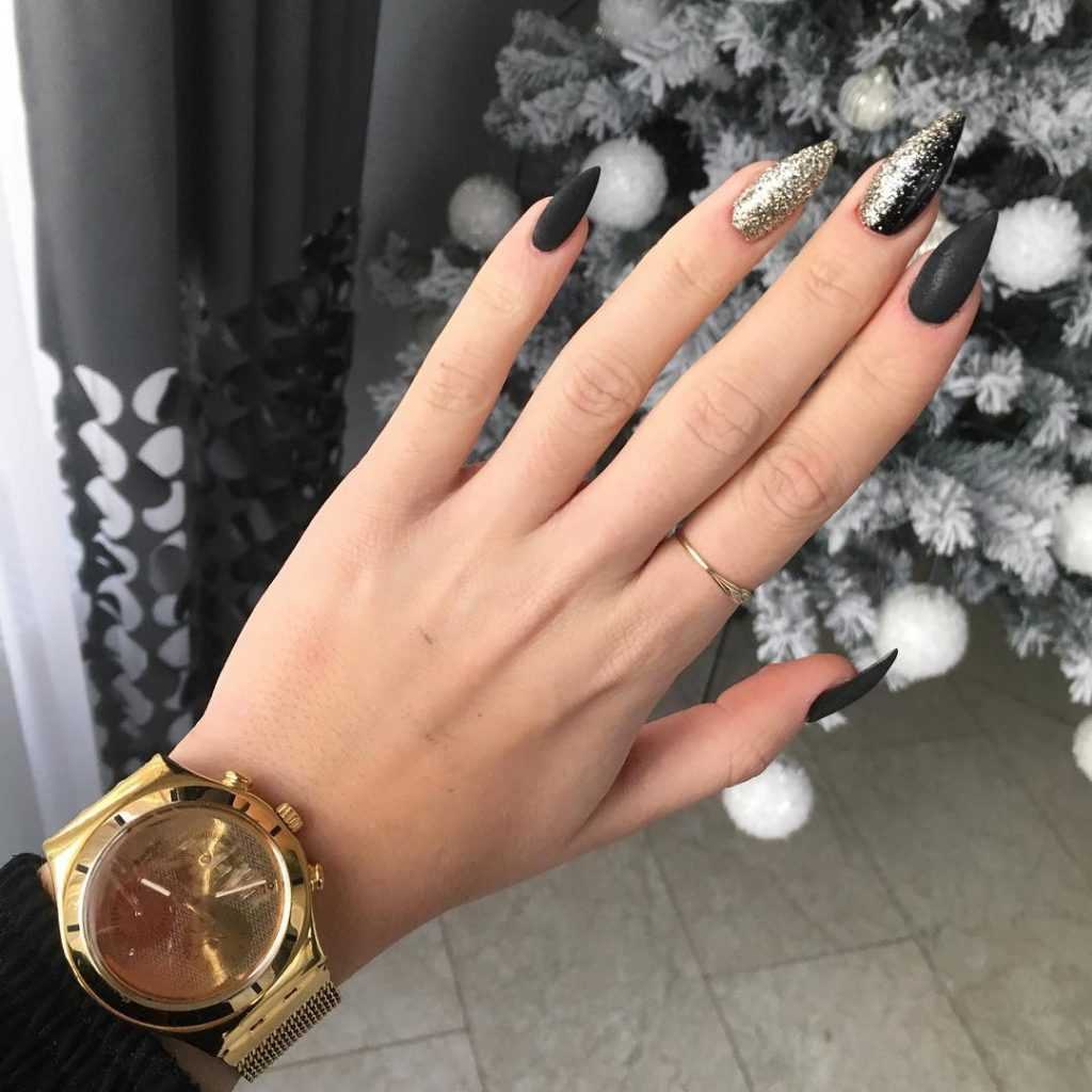 Даже такой цвет лака, как черный можно использовать для создания новогоднего маникюра, если правильно дополнить его. В качестве декора и дополнения в данном случае лучше использовать золото в виде лака, присыпки или специальной фольги.