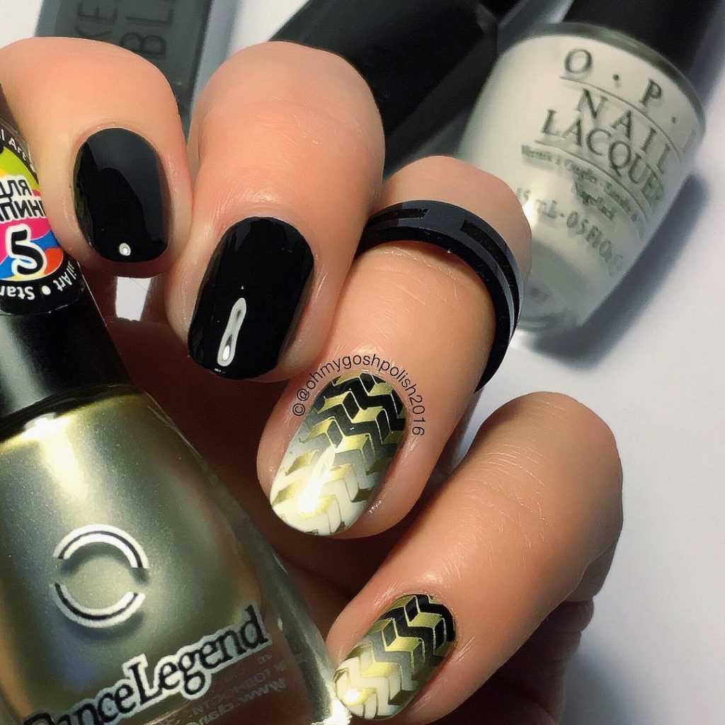 Праздничным может выглядеть и аккуратный черный маникюр, если украсить его акцентом с градиентом и золотым узором, сделанным с помощью стемпинга. Попробуйте сделать этот простой маникюр самостоятельно, с помощью короткого видео под фотографией.