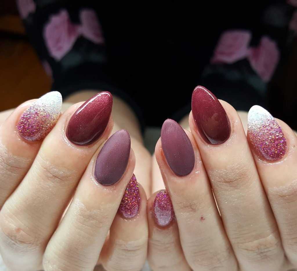 Очень эффектно выглядит на овальных или миндалевидных ноготках короткой длины тёмное покрытие. Это может быть лак чёрного, кофейного или же бордового цвета.