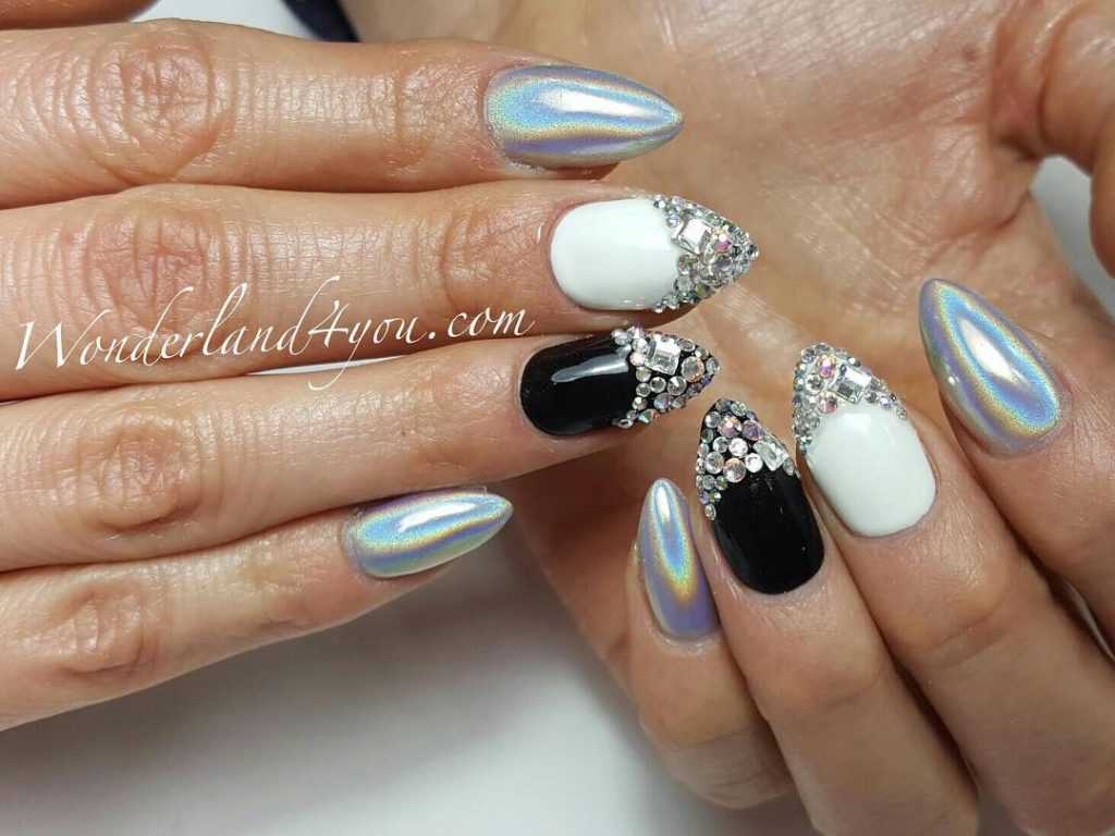 • изысканный новогодний френч – самыми яркими предложениями праздничного зимнего французского маникюра выступают сочетания двух компонентов: прозрачной основы базового покрытия и выкладки улыбок в виде не простого геля, а глубокой мерцающей слюды, отражающей световой фольги, аквариумной клади или точёной выкладки бульонок по уровню среза ногтевой пластины. Цвета ярко выложенной улыбки при этом могут быть разными: от иссиня-чёрного до безупречного белого, как с вкраплениями блёсток, так и в обособленном глянце. Дополнить композицию француза можно декором ноготка одного из пальцев в виде орнаментной росписи в качестве морозного оконного узора – эффект не заставит пожалеть о выборе такого дизайна;• маникюр со стразами – какая новогодняя ночь без яркого блеска, бликового мерцания и умопомрачительной нарядности каменной ногтевой выкладки? Можно как усеять всю поверхность одного из ноготков каменной гладью, так и выделить серединные элементы воссозданных на ноготках рисунков. Это может быть центр снежинки, выделенный стразиком, или серединная часть праздничного подарочного банта, воссозданного с помощью акриловой лепки, или же это может быть декоративная инкрустация новогодних игрушек, водружённых на ногтевую пластину в виде аквариумной или объёмной клади;• зеркальный эффект – пожалуй, один из самых востребованных дизайнов современности. Созданное при помощи фольги или втирки серебряное зеркало наряду с сочетанием из серебристого бархата матовой поверхности других ноготков позволяет своей обладательнице почувствовать себя поистине снежной королевой, королевой вечера и королевой новогодней ночи. В белой или серебристой цветовой тональности подобный дизайн отлично подойдёт к новогоднему празднеству и украсит вечер любой модницы.