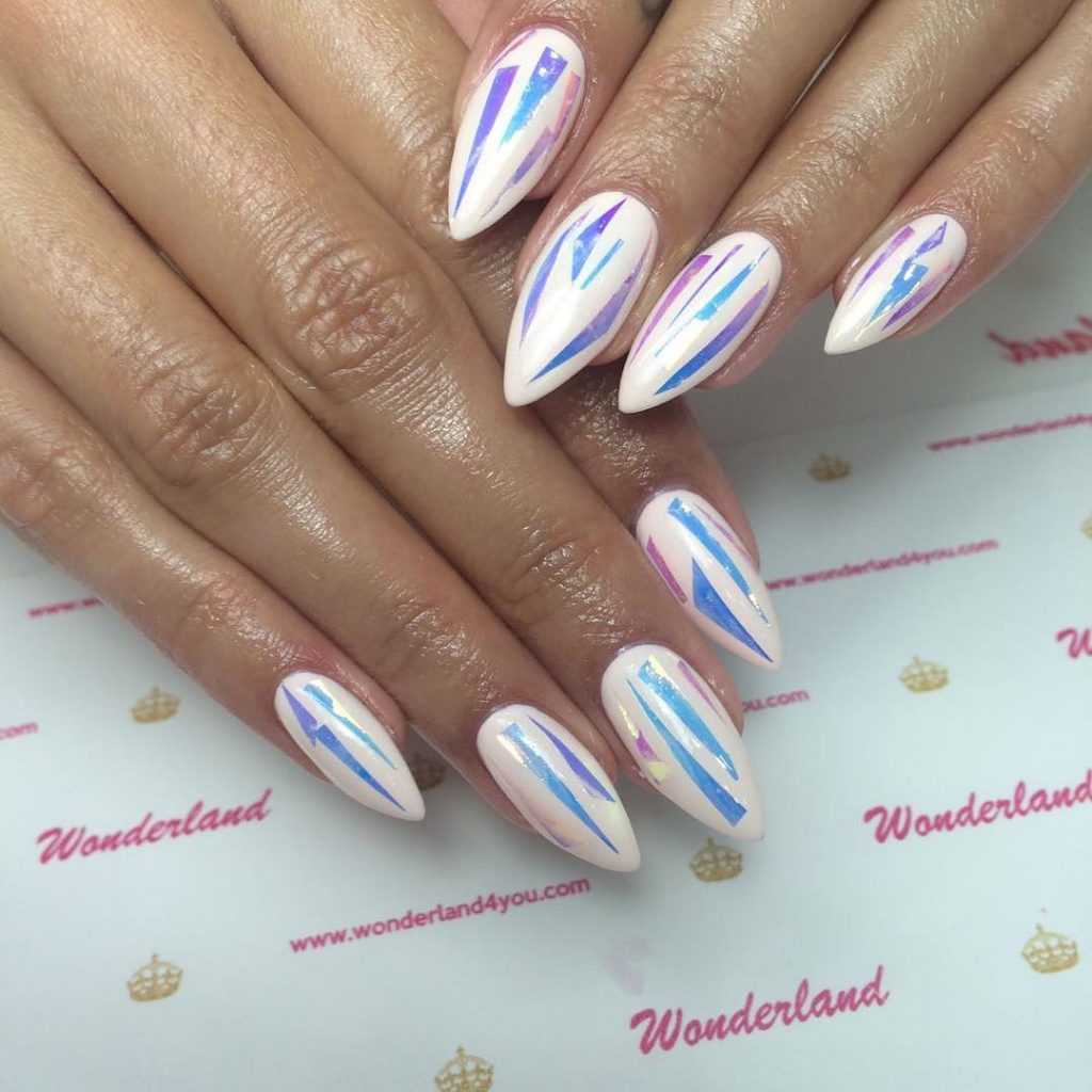 Треугольные и прямоугольные геометрические фигуры, состоящие из частичек фольги, не менее занимательно будут смотреться в новомодном графическом маникюре. Графические узоры на ногтях мастера могут дополнять фольгой:
