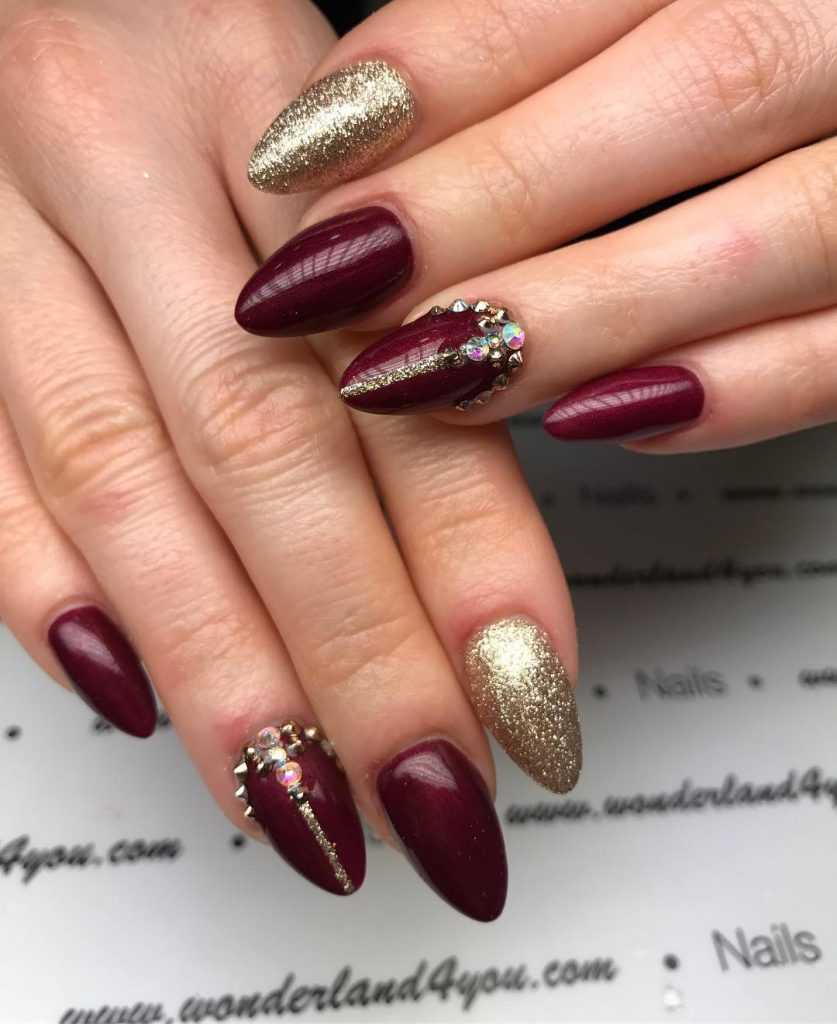 Также золото для новогоднего маникюра отлично сочетается с темно-коричневым, бордовым, темно-фиолетовым тонами. Золотом можно покрыть как весь ноготь, так и просто сделать из него декоративные элементы (например, в виде завитков, узоров и рисунков).
