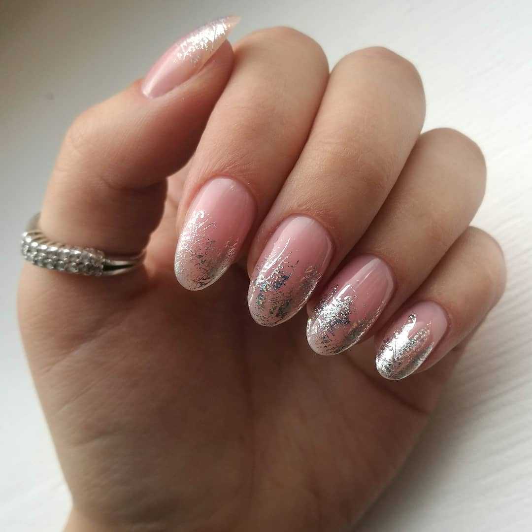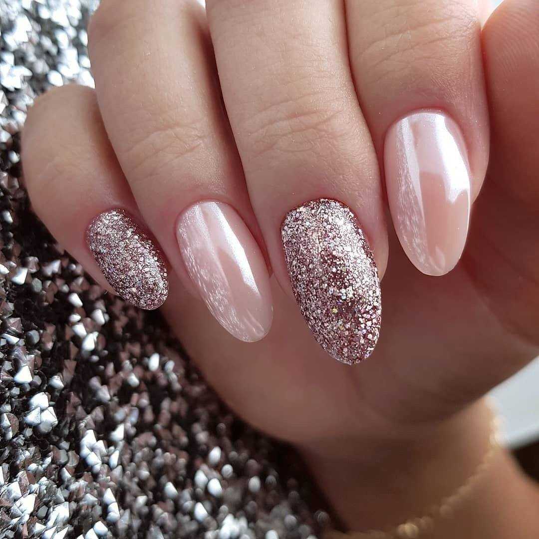 Наличие коротких ногтевых пластин совсем не означает отказ от нюдового маникюра с использованием блестящих частиц. Вы можете красиво украсить кончики ногтевых пластин глиттером или подчеркнуть природный оттенок основания кусочками блестящей фольги. Вертикальные блестящие полосы, помогут визуально вытянуть форму ногтей. Также очень привлекательно смотрятся выделенные блёстками лунки или аккуратные рисунки, расположенные на нескольких пальцах, например веточка с блестящими листиками украшает ногтевую пластину большого пальца, а одиночный, словно оторвавшийся и унесённый лёгким порывом ветра листик, на другом пальце.