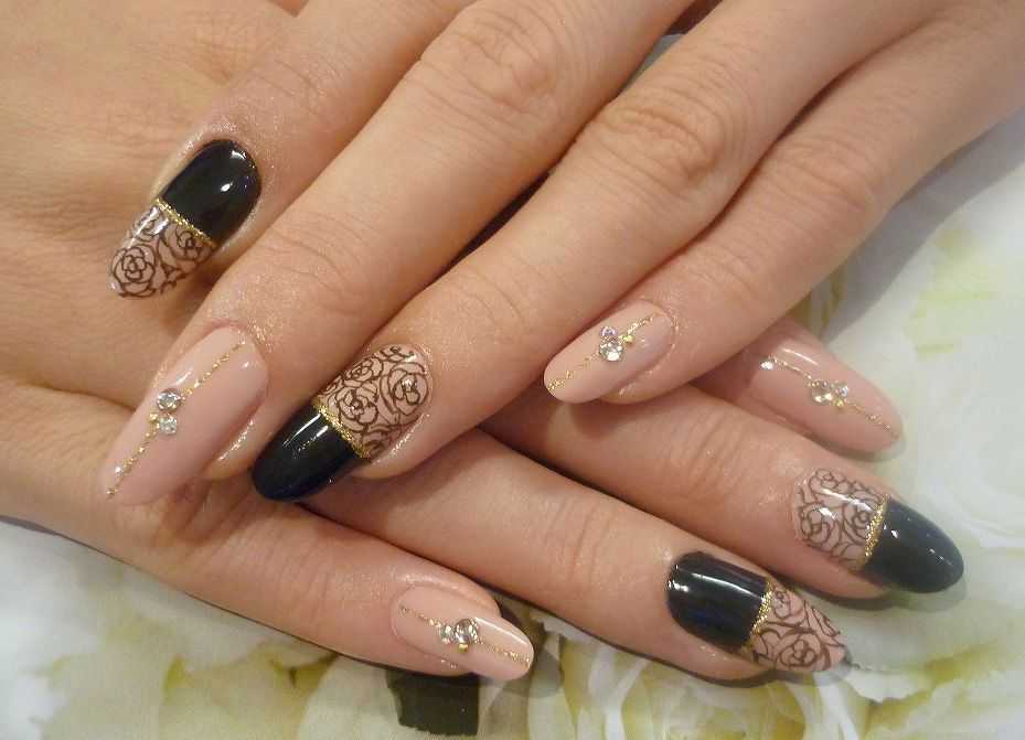 • декор со стразами – разделённая серединной выкладкой из белых камней на чёрном фоне, усеянная в диагональной плоскости поверхность ногтевой пластины или вообще полностью покрытое стразами ногтевое ложе – в любой манере расположения разнокалиберных светлых камней на тёмном фоне подобный миндальный маникюр будет смотреться просто блестяще. Здесь можно играть с цветами и менять, например, основу с тёмной на светлую, а стразы при этом с белых на чёрные. Эффект в любом случае будет потрясающим;• битое стекло – ещё один будоражащий сознание маникюр, завораживающий магическим мерцанием имитированных осколков серебряного или золотого стекла из фольги на глянцевом чёрном базовом покрытии;• парчовый френч – удивительная тенденция к оформлению объёмной росписи на матовой поверхности миндалевидных ноготков в дорогих аристократических расцветках смотрится особенно нарядно. Обрамлённая выпуклыми парчовыми вензелями улыбка французского маникюра выглядит довольно презентабельно и буржуазно.