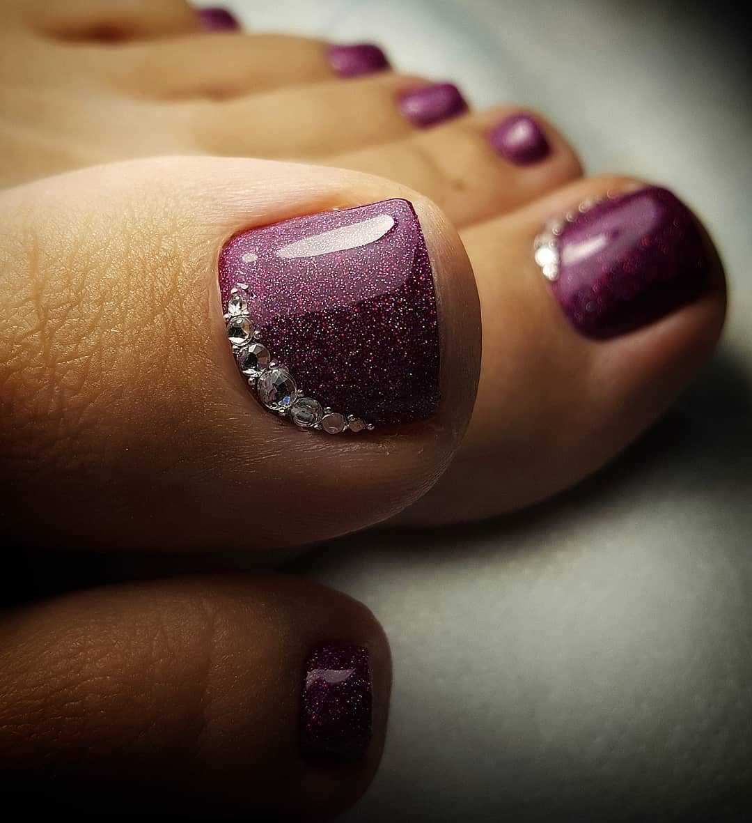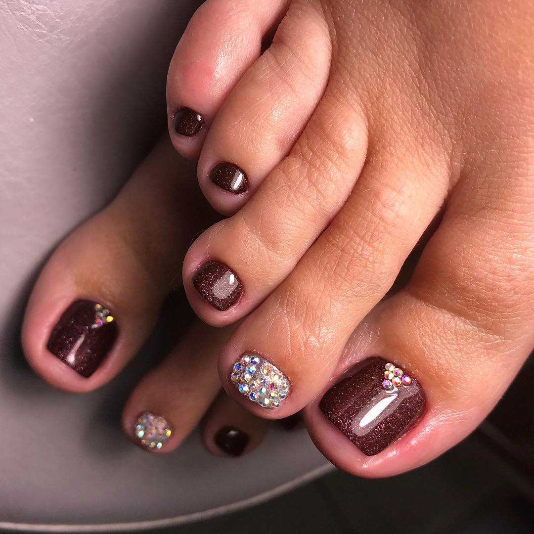 Блеск и сияние остаются в тренде. В модном педикюре 2019 года приветствуется лак с блестящими частичками или глиттерами разных размеров и оттенков, а также дизайн со стразами и камнями.