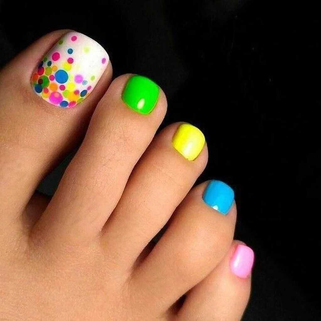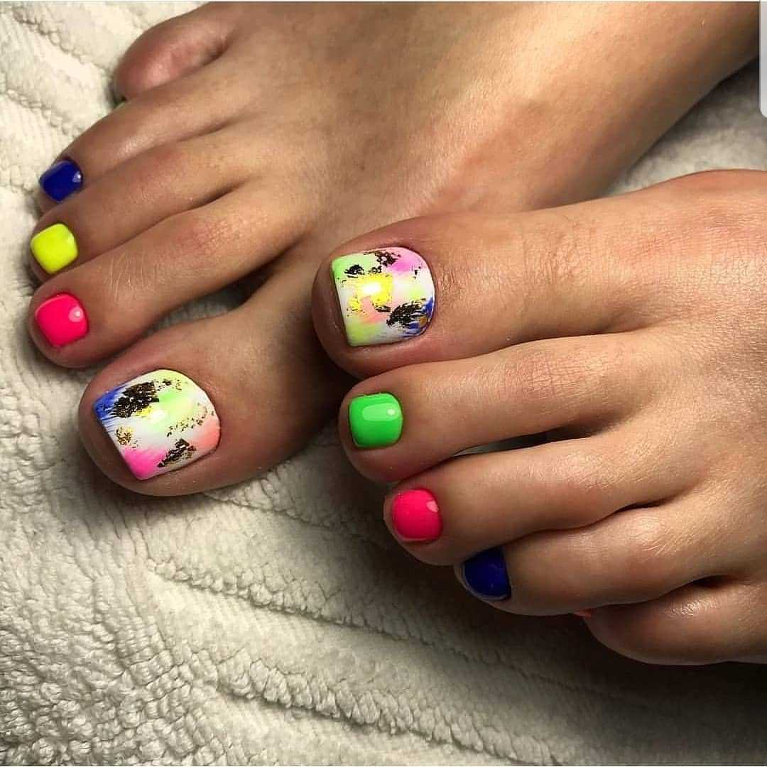 Как вариант – неоновое покрытие, особенно актуален такой педикюр под вечернее платье или в очень жаркие летние дни.