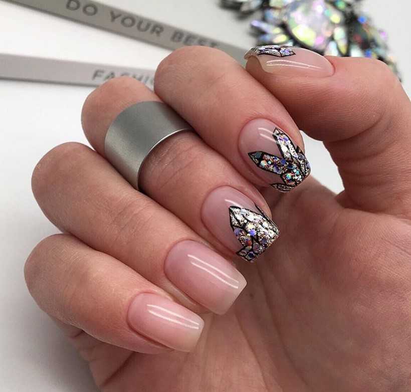 Конечно же в трендах опять своим великолепным блеском сверкает битое стекло. Техника украшения ногтей кусочками оригинальной фольги отличается своей привлекательностью и в то же время простотой.