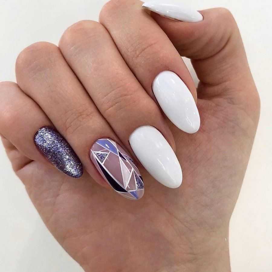 В 2020 году стоит присмотреться к геометрическому дизайну. Тонкие линии, фигуры и точки – все это можно использовать для создания бесчисленного количества рисунков на любой вкус. К тому же, многое зависит от техники нанесения. В домашних условиях использовать кисти не всегда удобно. Выбирайте стемпинг для симметричности. С помощью блесток можно подчеркнуть одну-две линии, что сделает дизайн чуть более ярким.