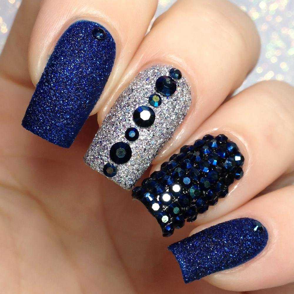 Самый глубокий цвет, комбинируется с белым тоном. Синий оригинально смотрится в маникюре с красным и чёрным. Светло-серый и синий подойдёт для будней и официальных торжеств.