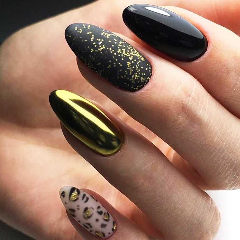 Черный маникюр с золотистым декором всегда смотрится загадочно и шикарно. Для получения еще большего эффекта рекомендуется использовать матовую основу и негативное пространство.