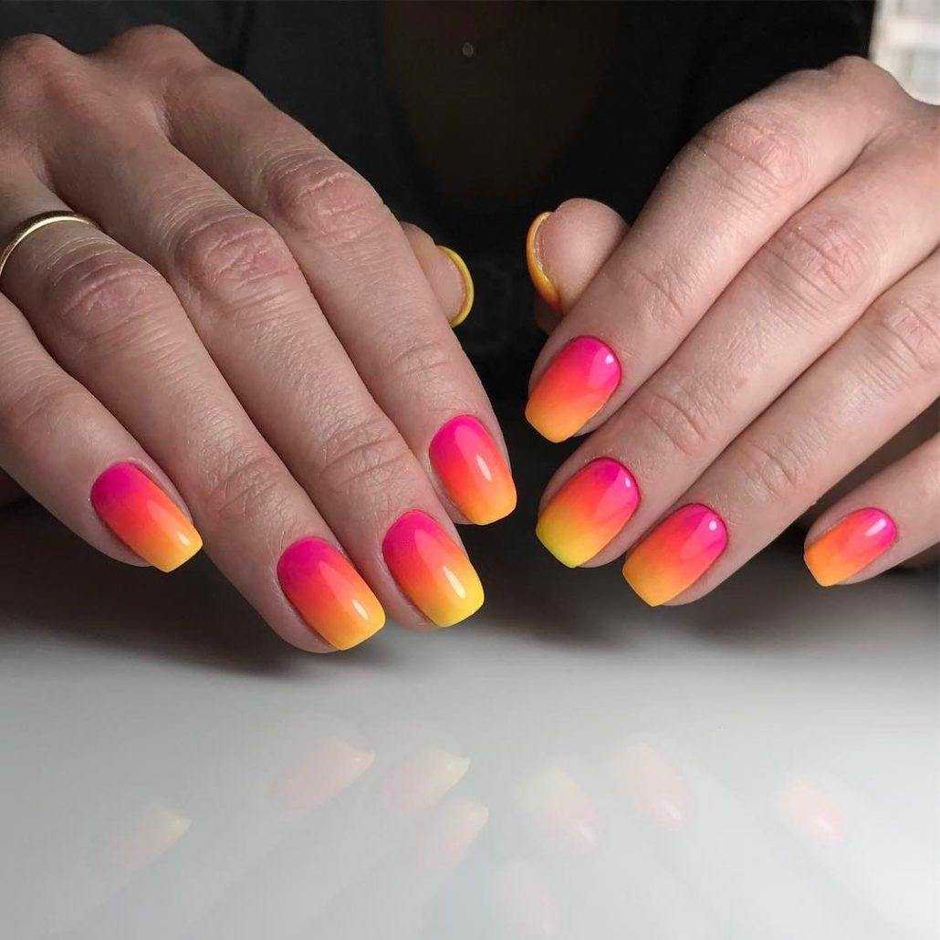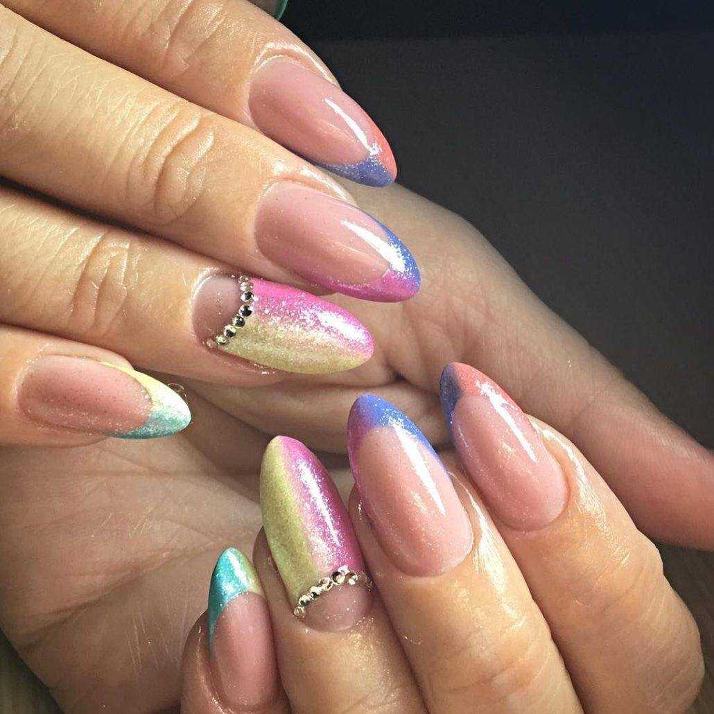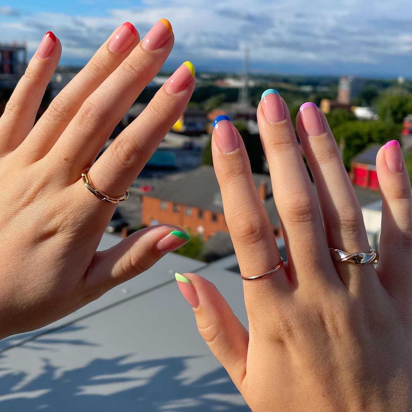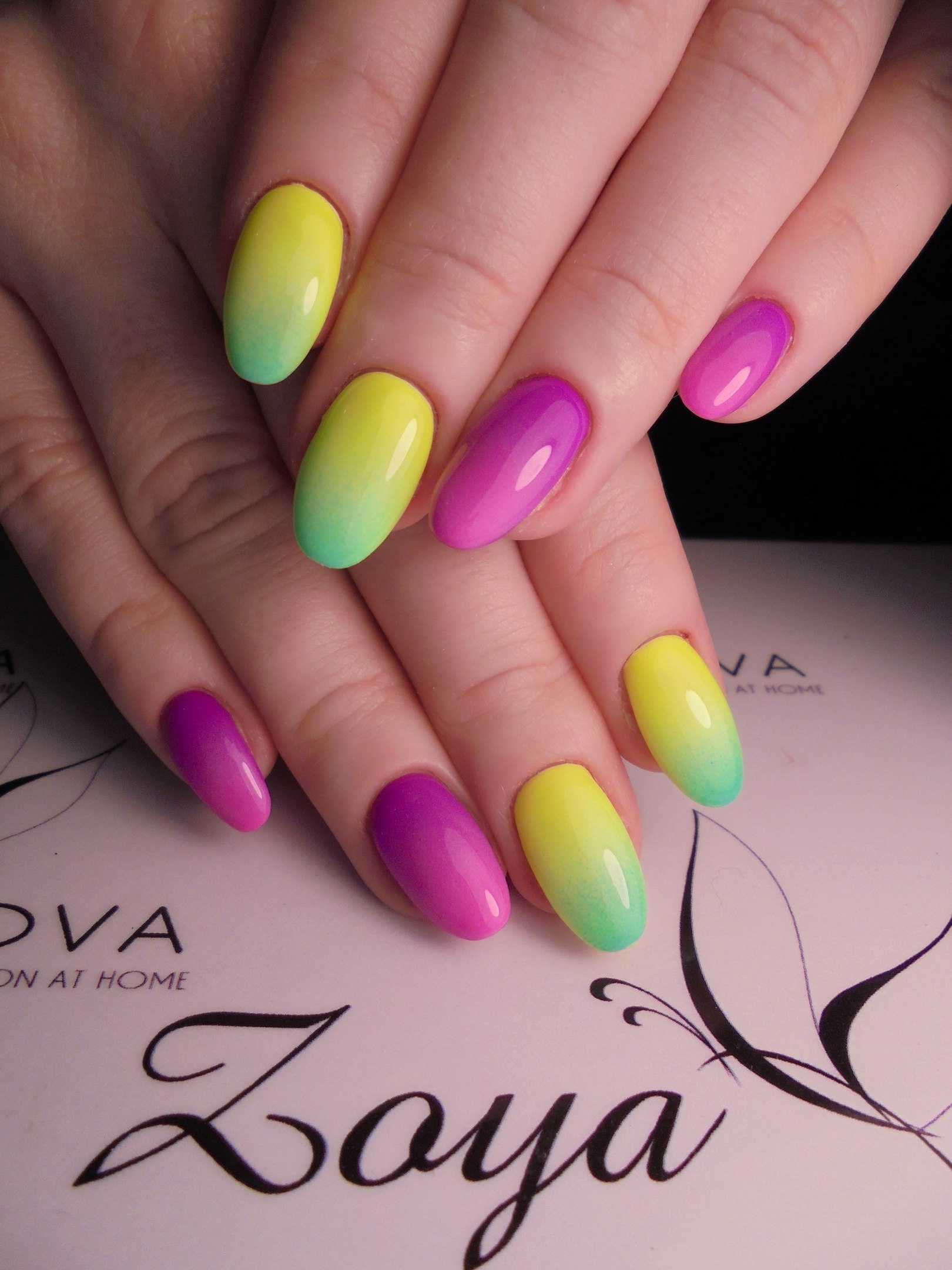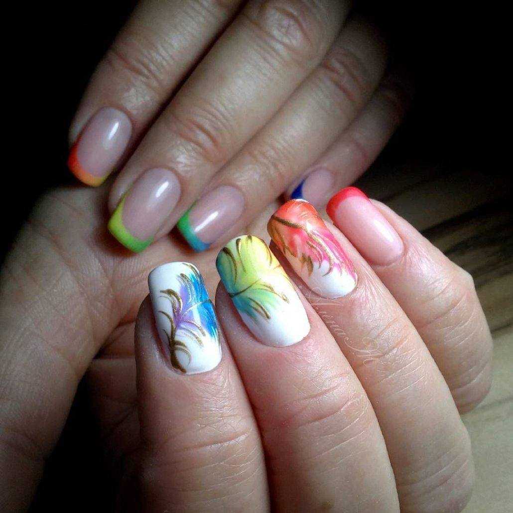 Данный вариант идеально подойдет позитивным девушкам. Разноцветная линия улыбки произвела на всех настоящий фурор. Также изобилие цветовых оттенков могут иметь все ногтевые пластины. В тоже время маникюр может выполняться в однотонном ярком варианте. Но для молодого поколения мастера маникюра рекомендуют разбавить скучные будни при помощи росписи в радужном варианте. Что касается градиента, который служит для прорисовывания кончика ноготка, то тут все напрямую зависит от их длины. На короткой ногтевой пластине лучше всего наносить вертикальную полосу, а на длинные коготки — горизонтальную линию.