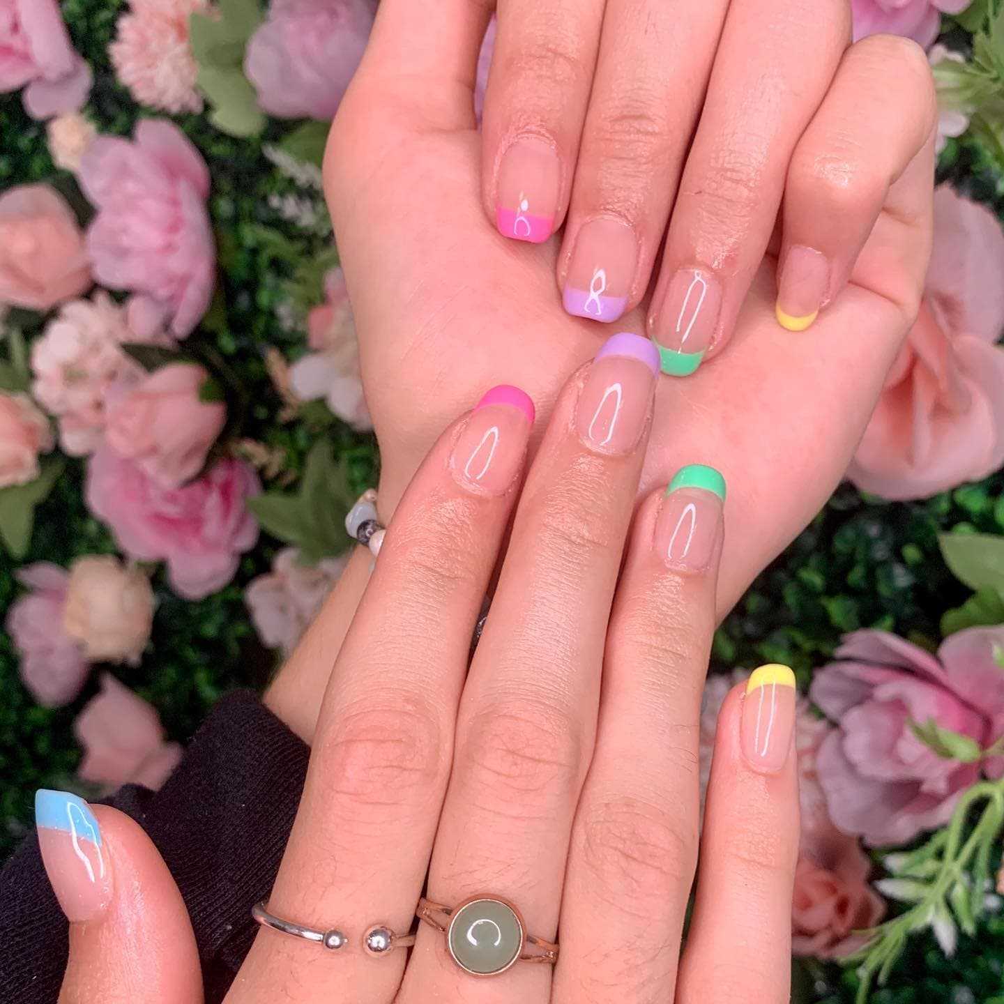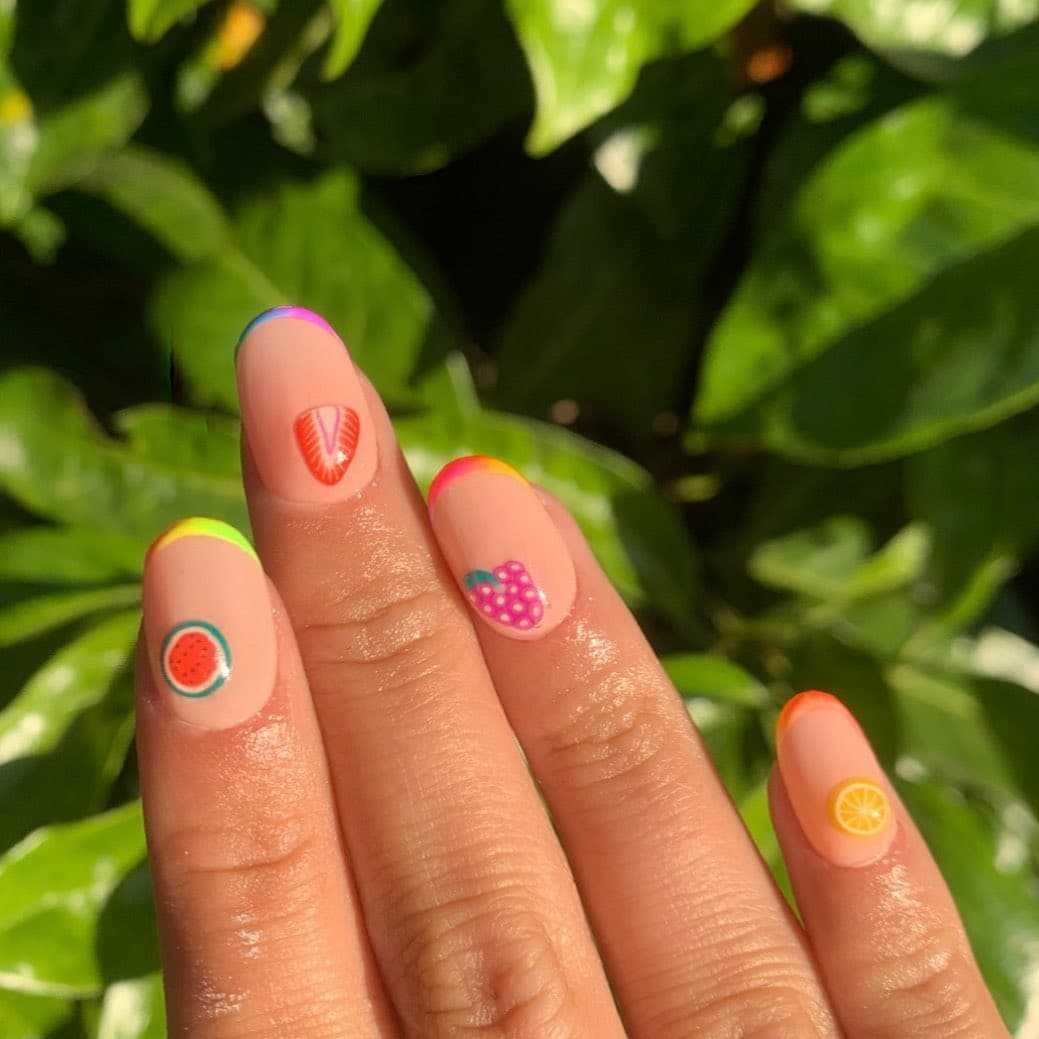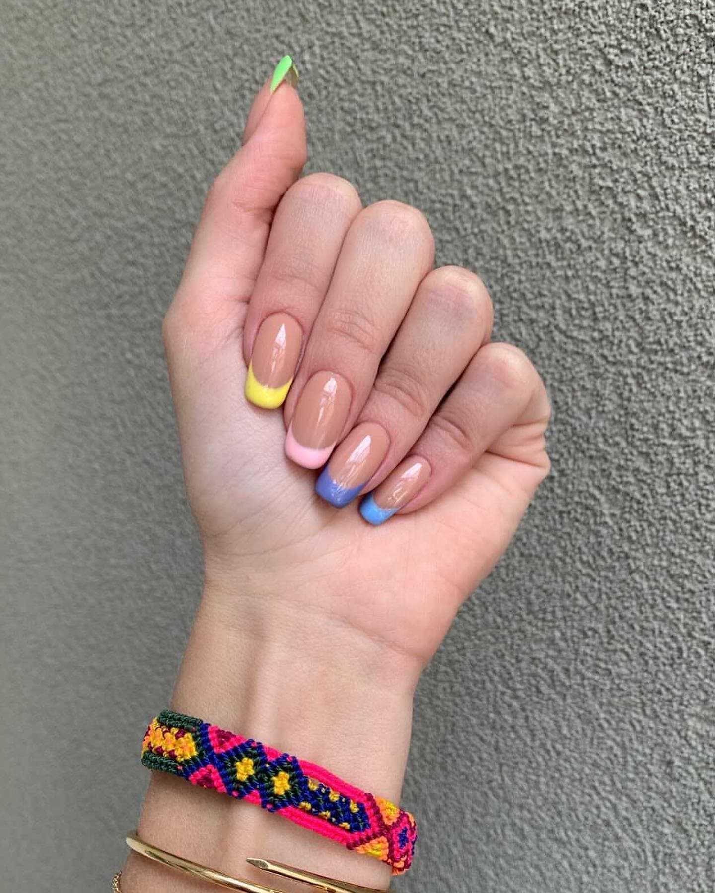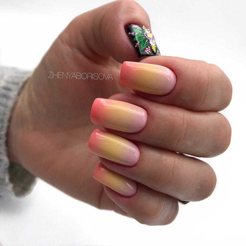 Данный вариант идеально подойдет позитивным девушкам. Разноцветная линия улыбки произвела на всех настоящий фурор. Также изобилие цветовых оттенков могут иметь все ногтевые пластины. В тоже время маникюр может выполняться в однотонном ярком варианте. Но для молодого поколения мастера маникюра рекомендуют разбавить скучные будни при помощи росписи в радужном варианте. Что касается градиента, который служит для прорисовывания кончика ноготка, то тут все напрямую зависит от их длины. На короткой ногтевой пластине лучше всего наносить вертикальную полосу, а на длинные коготки — горизонтальную линию.