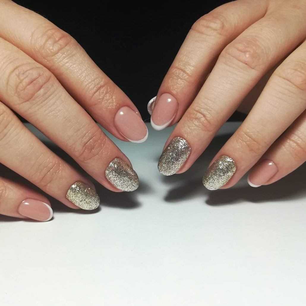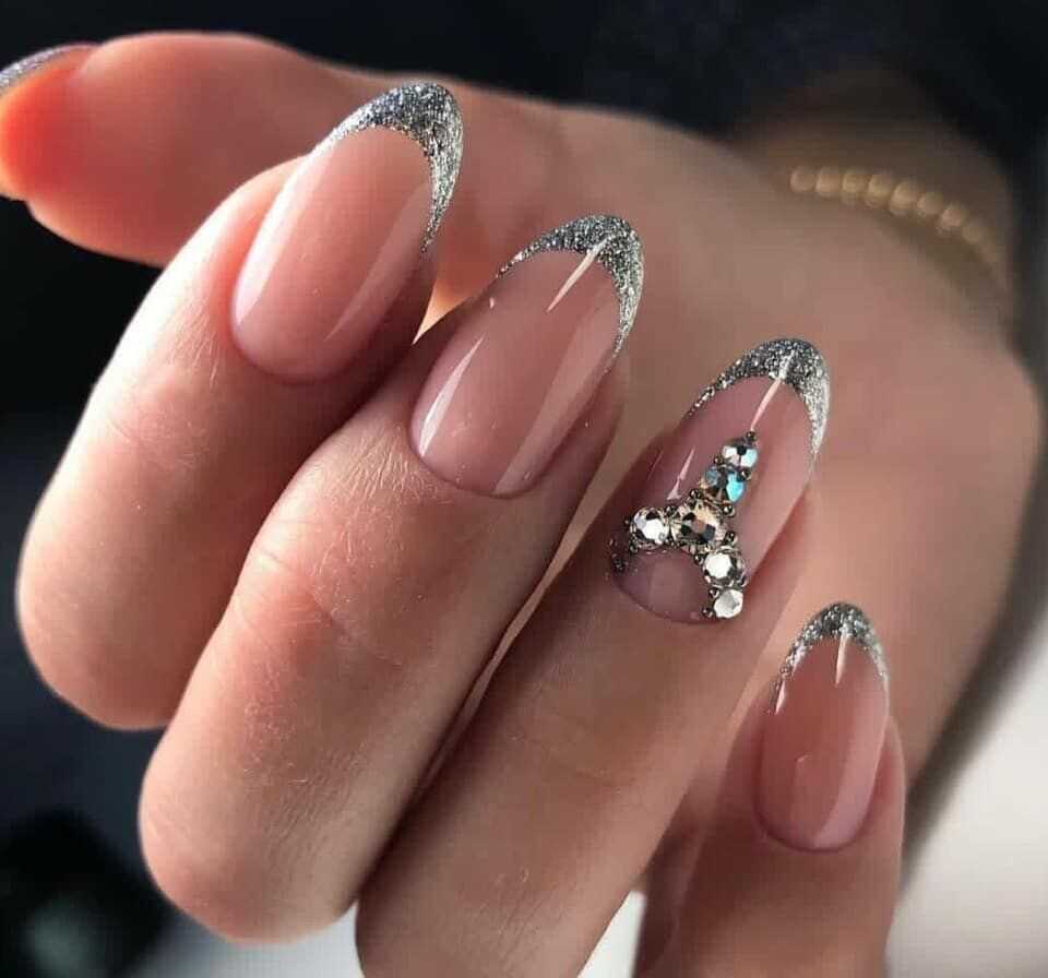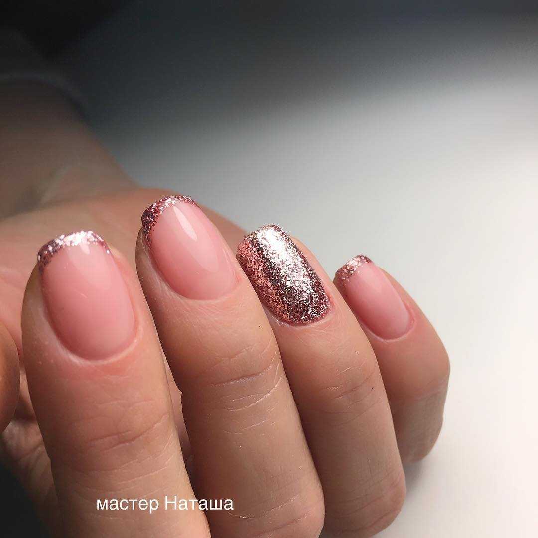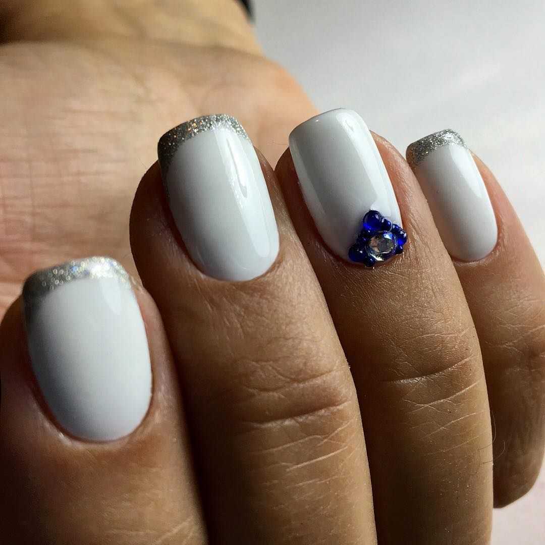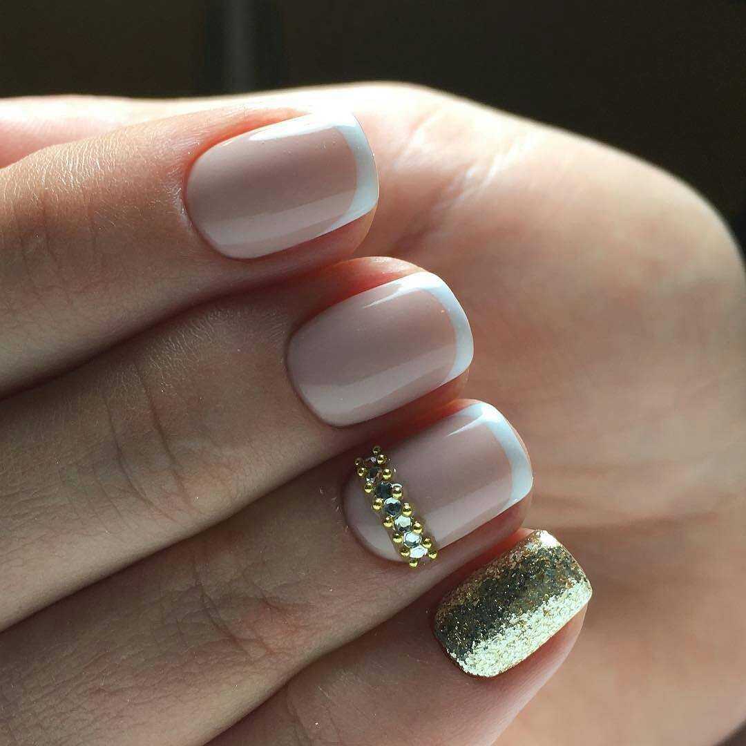 Френч всегда можно дополнить блестящим дизайном — блестками или стразами. Сверкающим декором выделяют улыбку или другую зону ногтя. Если хотите сделать дизайн в стиле минимализм, используйте минимальное количество камней и глиттера. Если маникюр нужен для праздника — не ограничивайте себя.