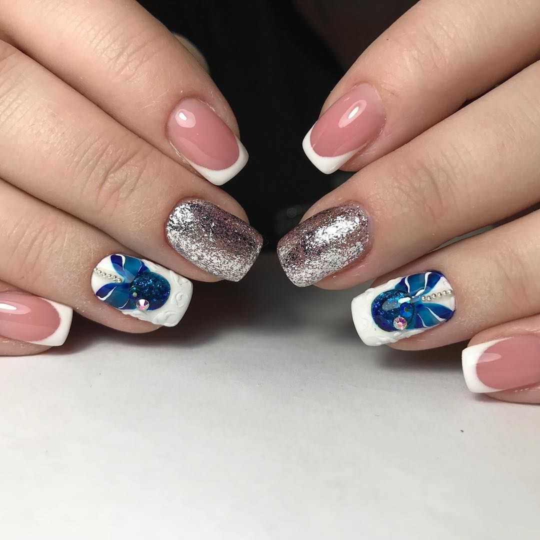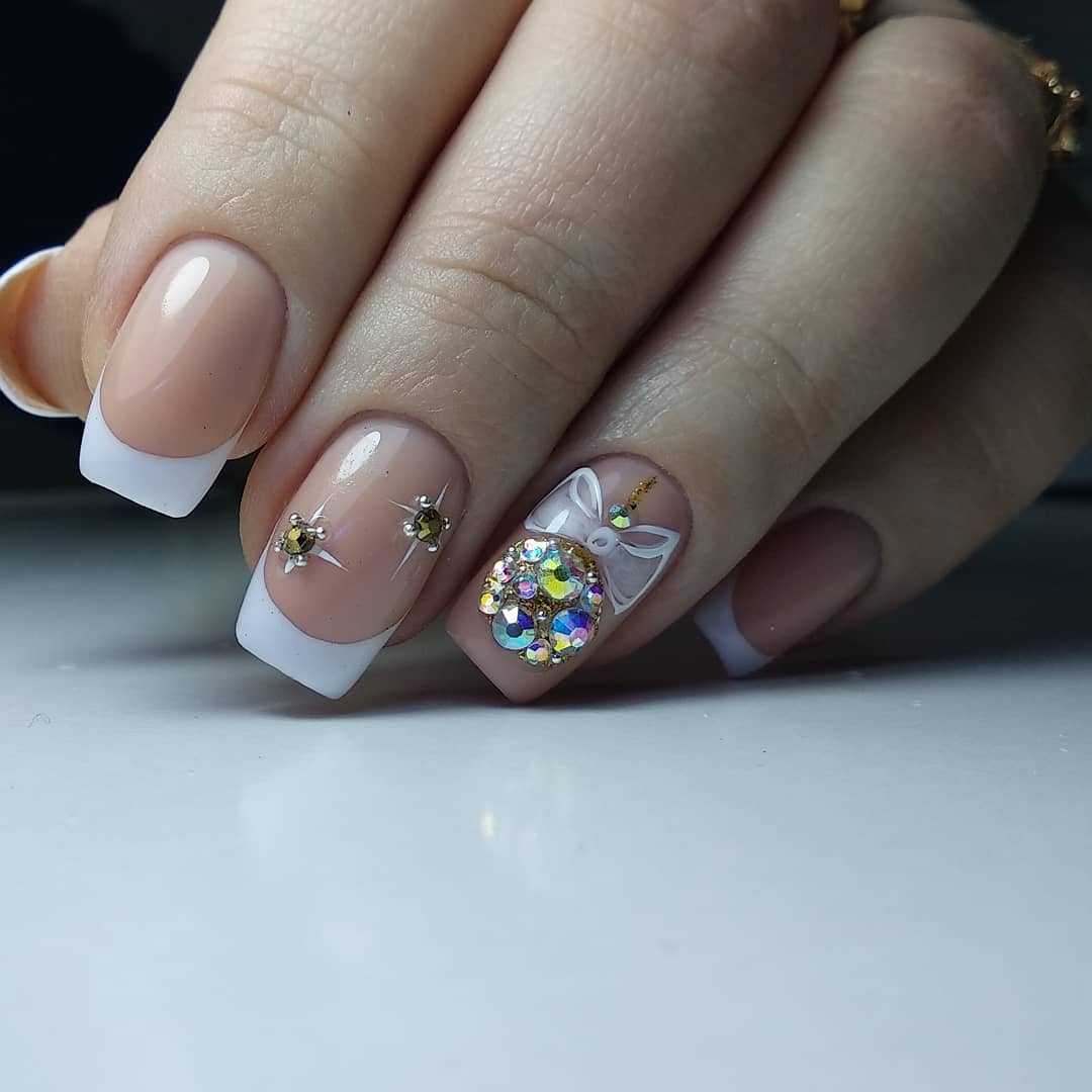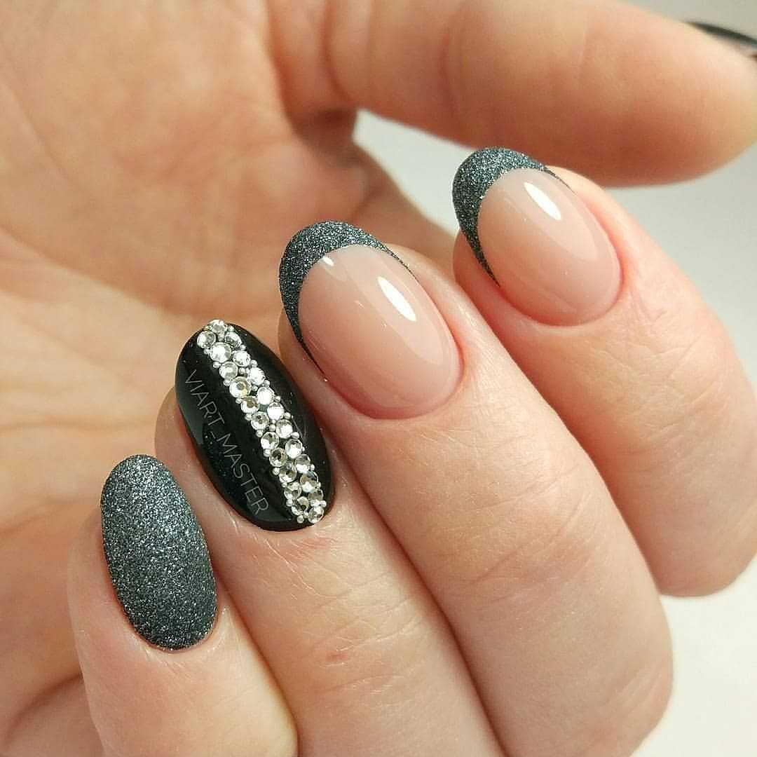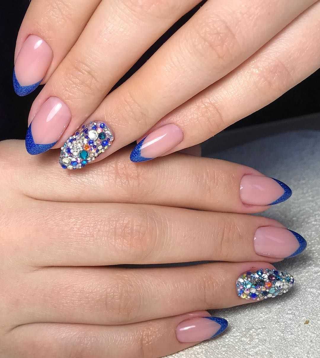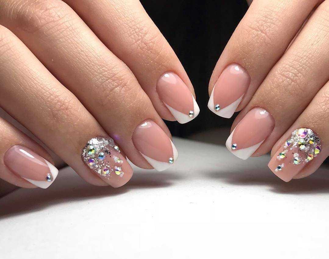 Френч всегда можно дополнить блестящим дизайном — блестками или стразами. Сверкающим декором выделяют улыбку или другую зону ногтя. Если хотите сделать дизайн в стиле минимализм, используйте минимальное количество камней и глиттера. Если маникюр нужен для праздника — не ограничивайте себя.