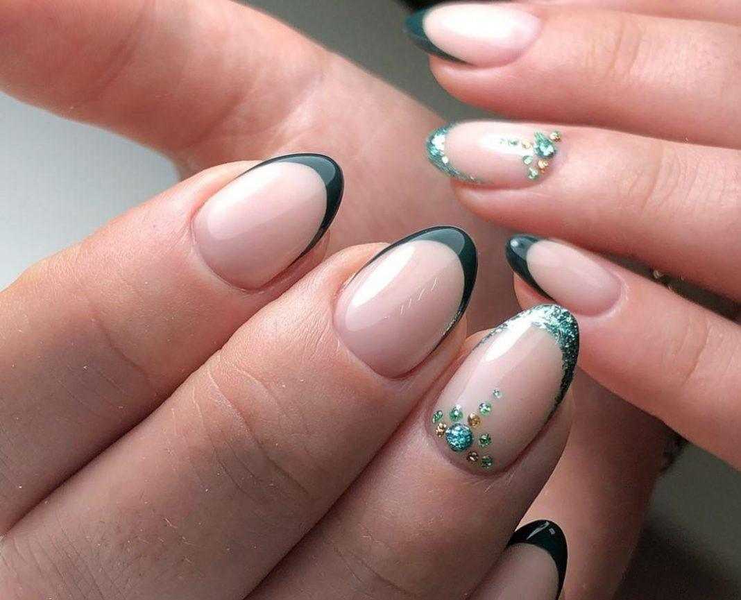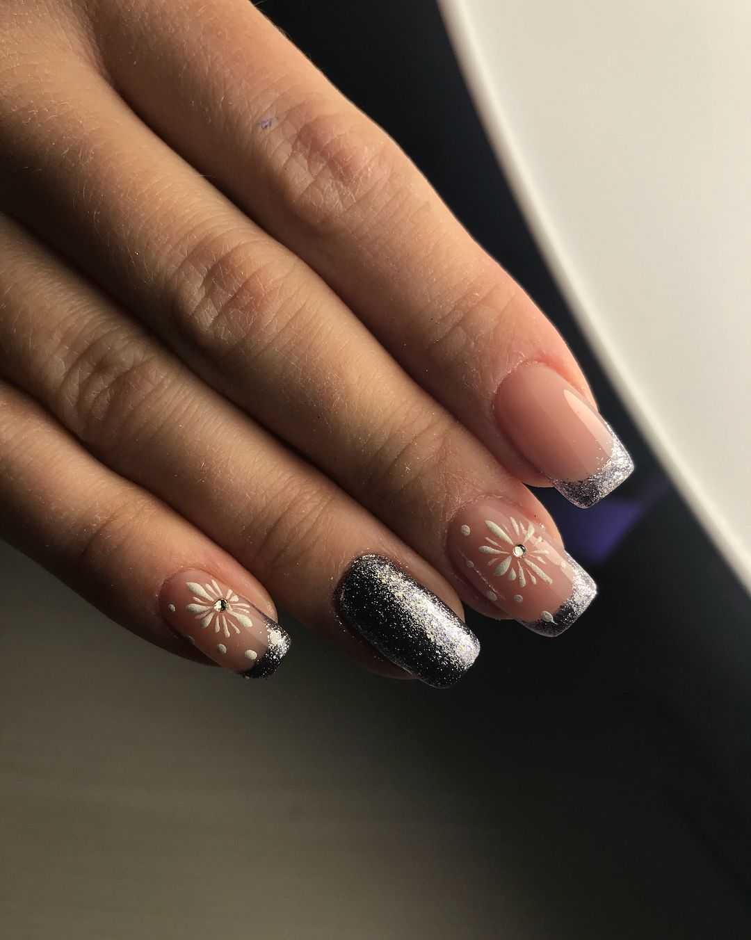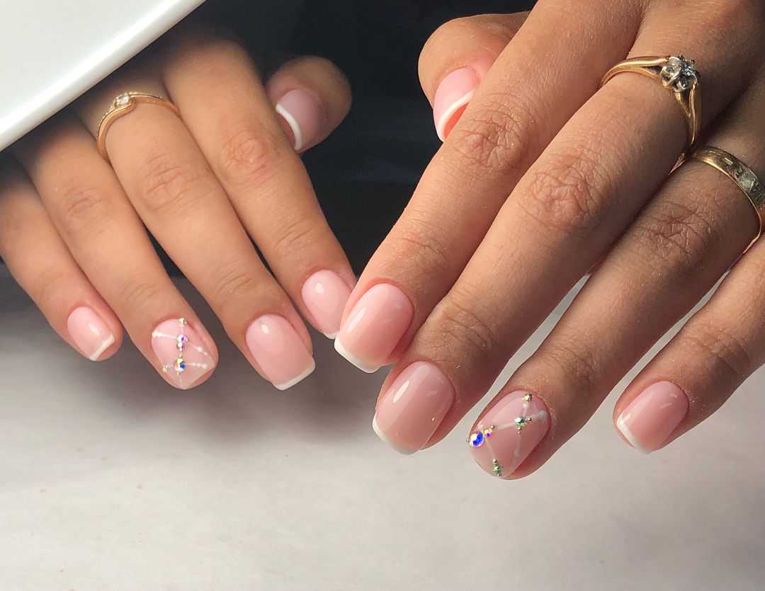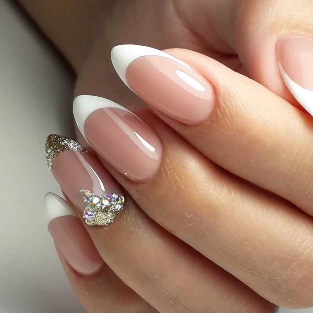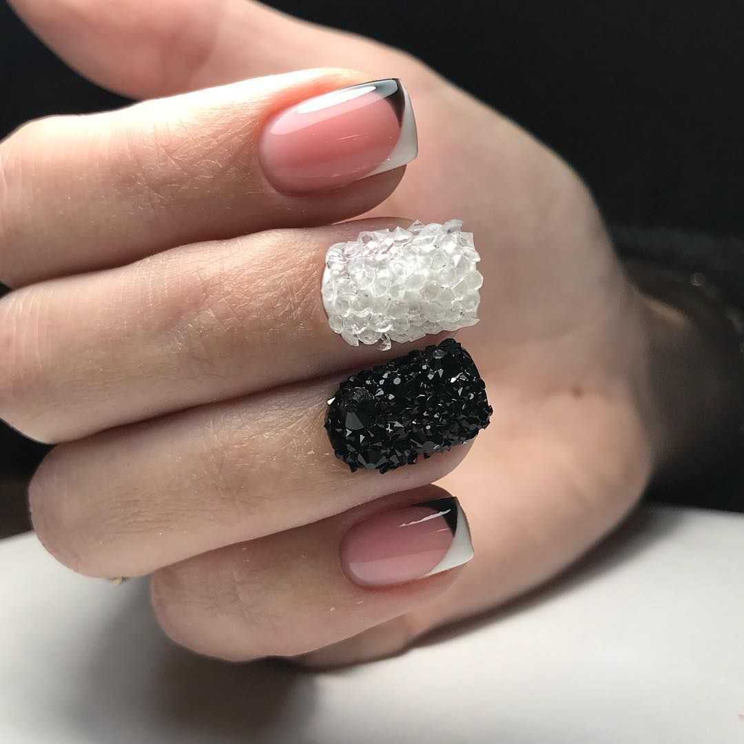 Френч всегда можно дополнить блестящим дизайном — блестками или стразами. Сверкающим декором выделяют улыбку или другую зону ногтя. Если хотите сделать дизайн в стиле минимализм, используйте минимальное количество камней и глиттера. Если маникюр нужен для праздника — не ограничивайте себя.