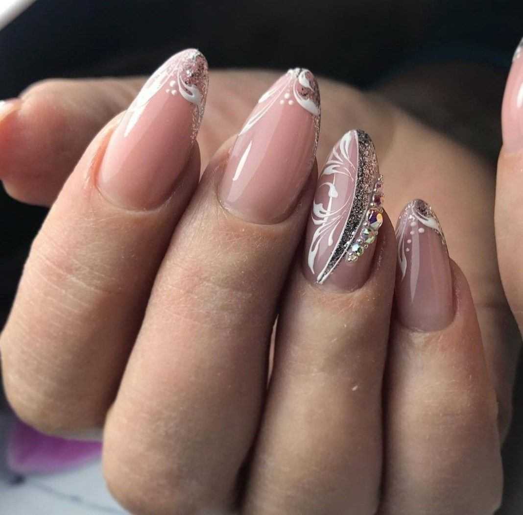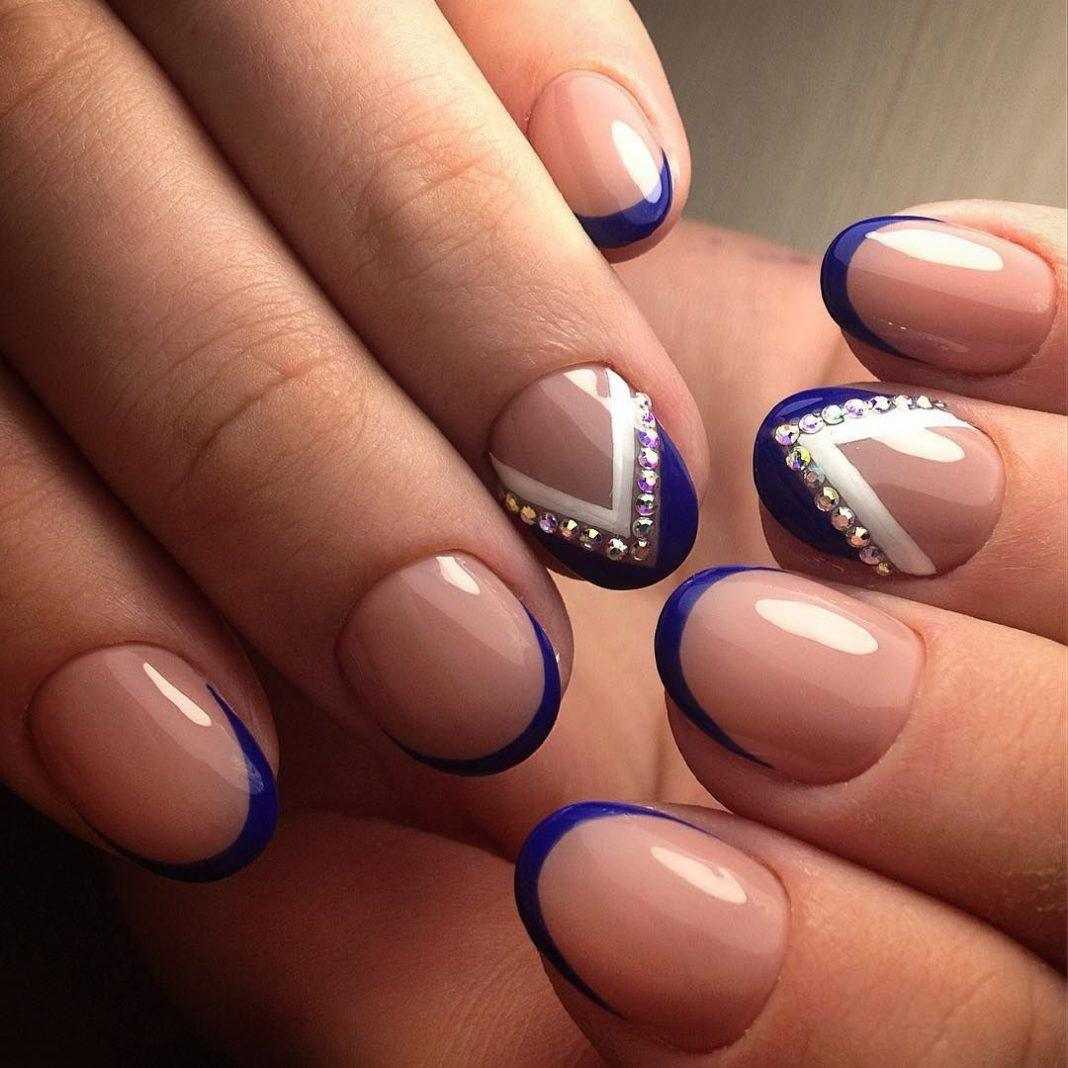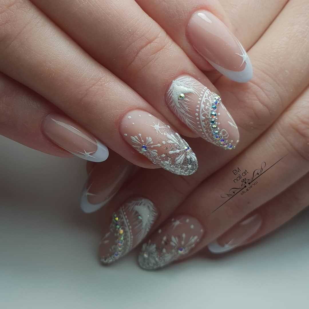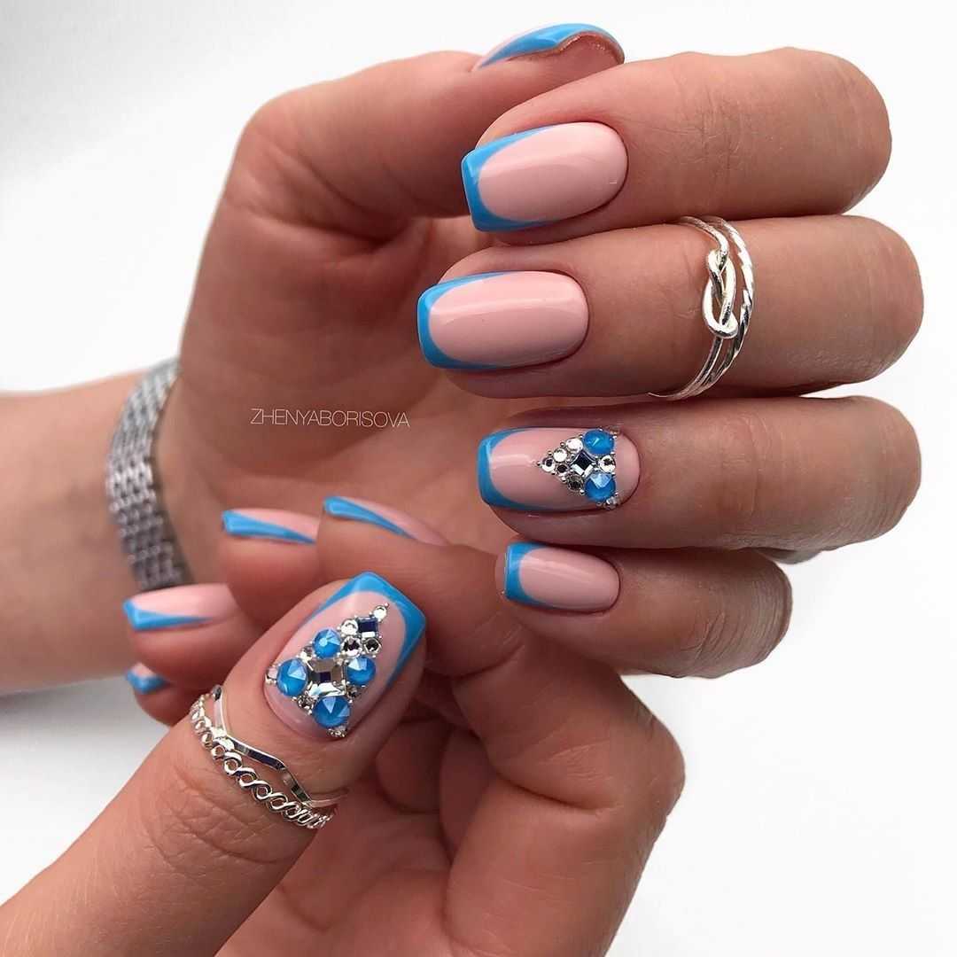 Френч всегда можно дополнить блестящим дизайном — блестками или стразами. Сверкающим декором выделяют улыбку или другую зону ногтя. Если хотите сделать дизайн в стиле минимализм, используйте минимальное количество камней и глиттера. Если маникюр нужен для праздника — не ограничивайте себя.