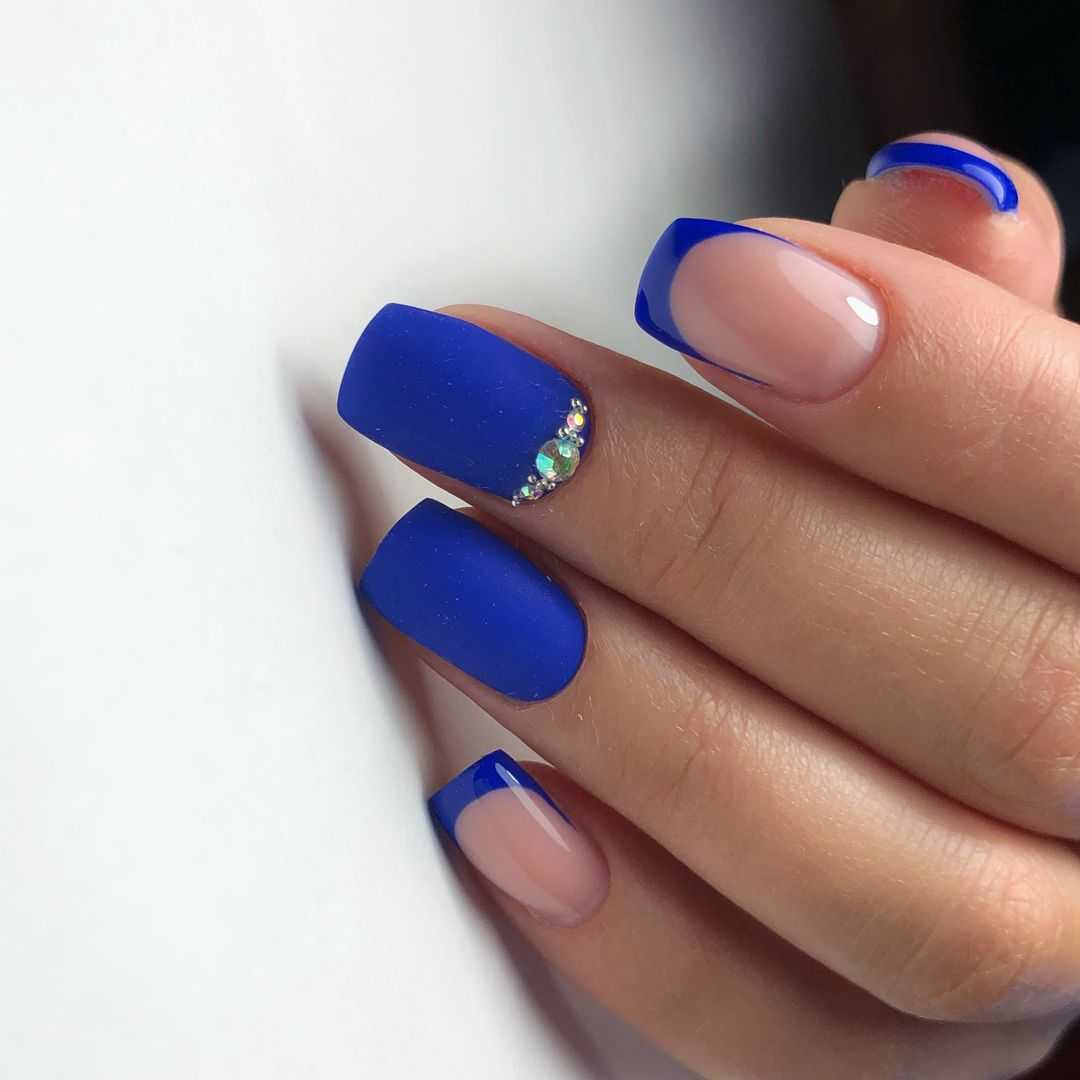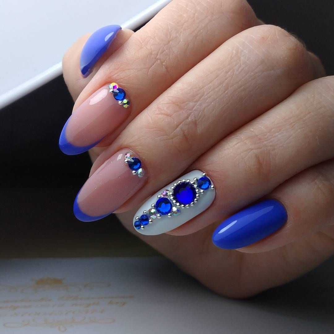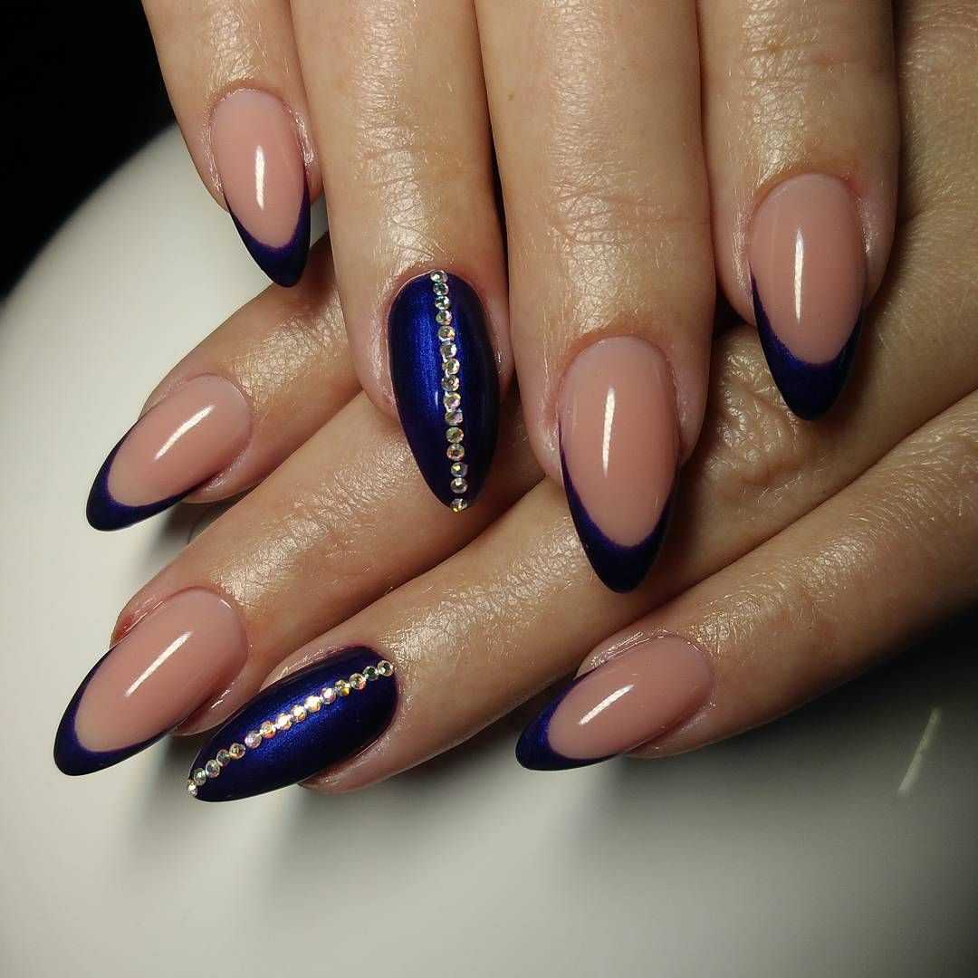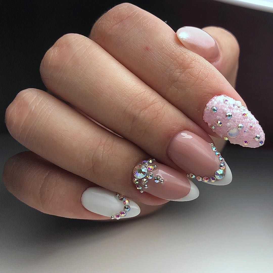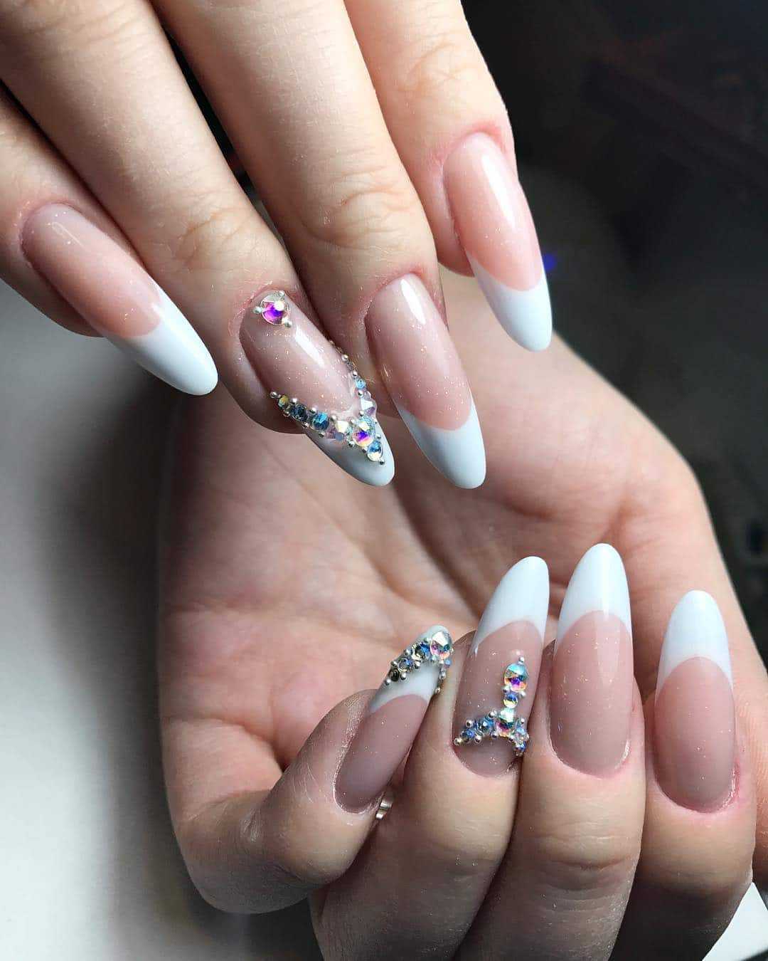 Френч всегда можно дополнить блестящим дизайном — блестками или стразами. Сверкающим декором выделяют улыбку или другую зону ногтя. Если хотите сделать дизайн в стиле минимализм, используйте минимальное количество камней и глиттера. Если маникюр нужен для праздника — не ограничивайте себя.