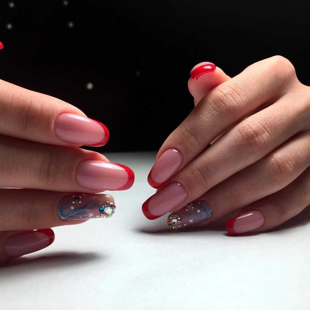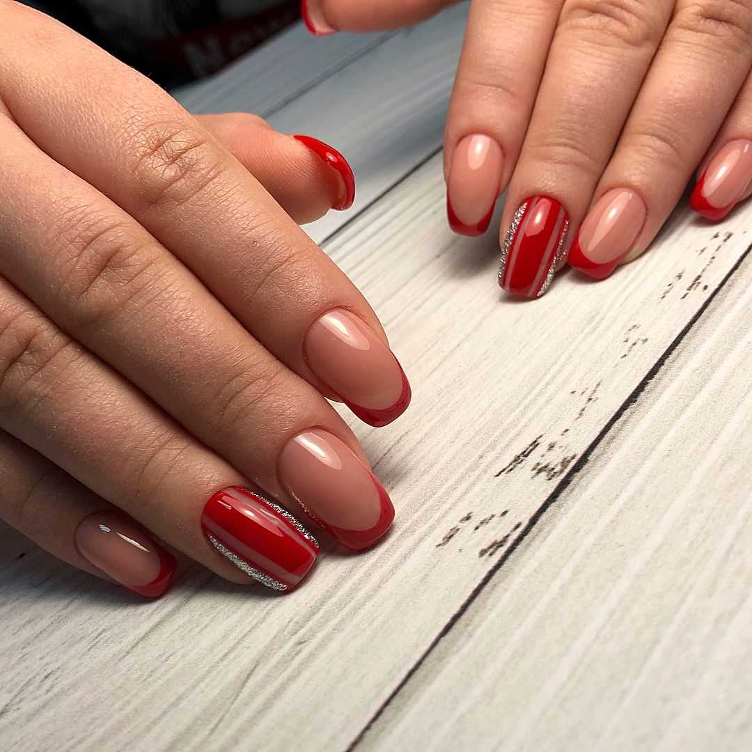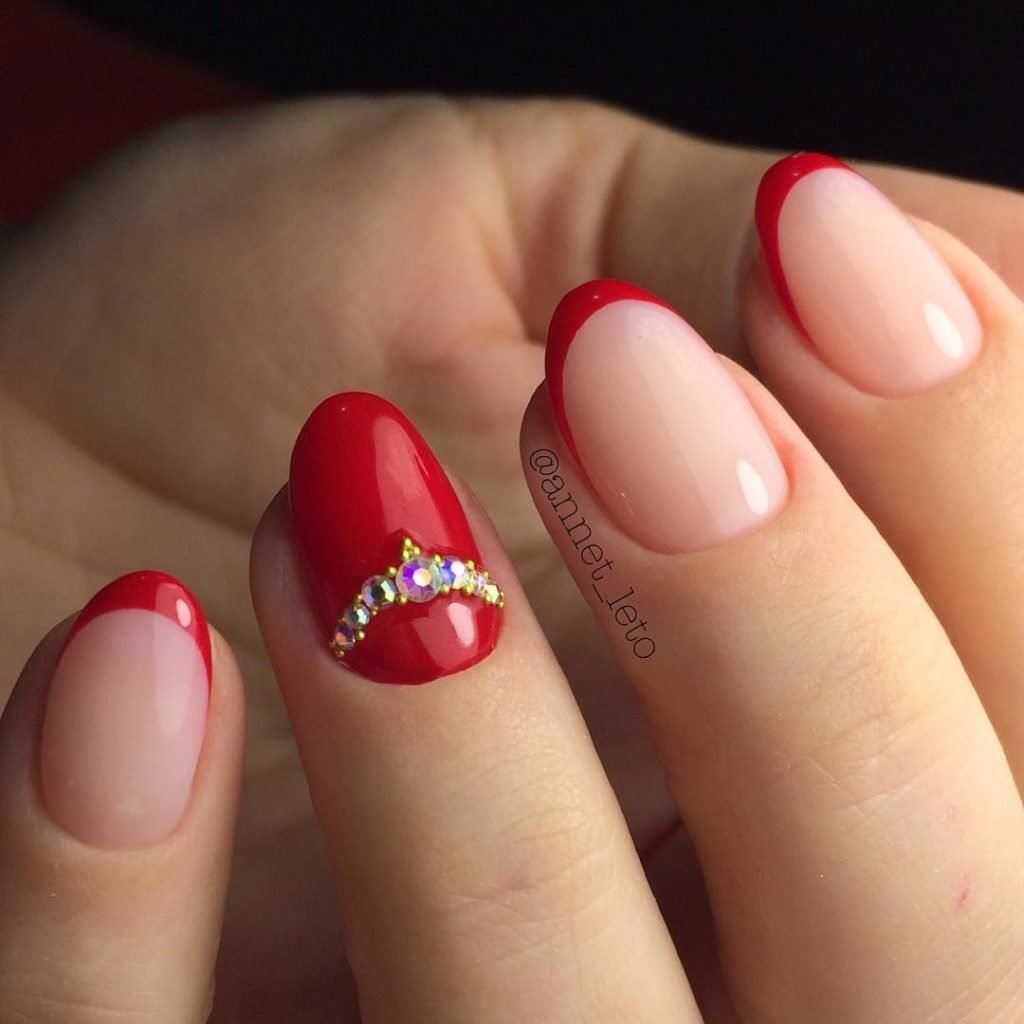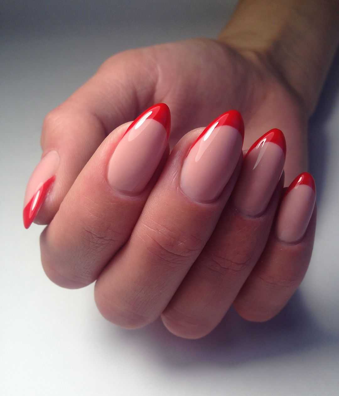 Ультрамодный маникюр френч 2022 года представляет собой почти классический дизайн. Вот только выступающий край ногтя окрашен не в белый, а в красный цвет. Такой вариант выглядит очень естественно и при этом ярко и неординарно, ведь сочетает в себе сразу два классических приема – френч и красный лак.