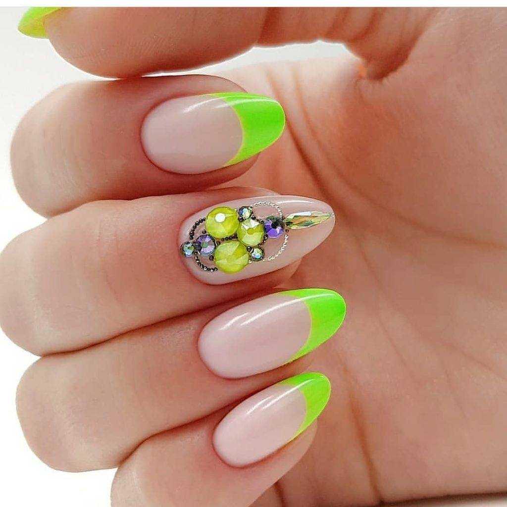 - Использование нежных, ярких оттенков гель-лака, перекликающихся с дополнительными акцентами или контрастирующих с основой;