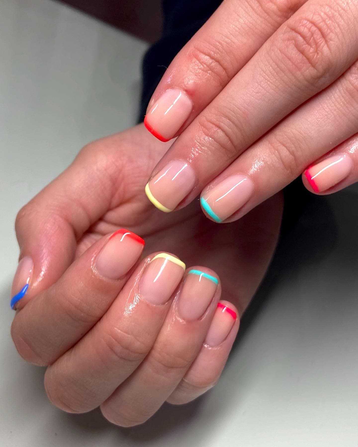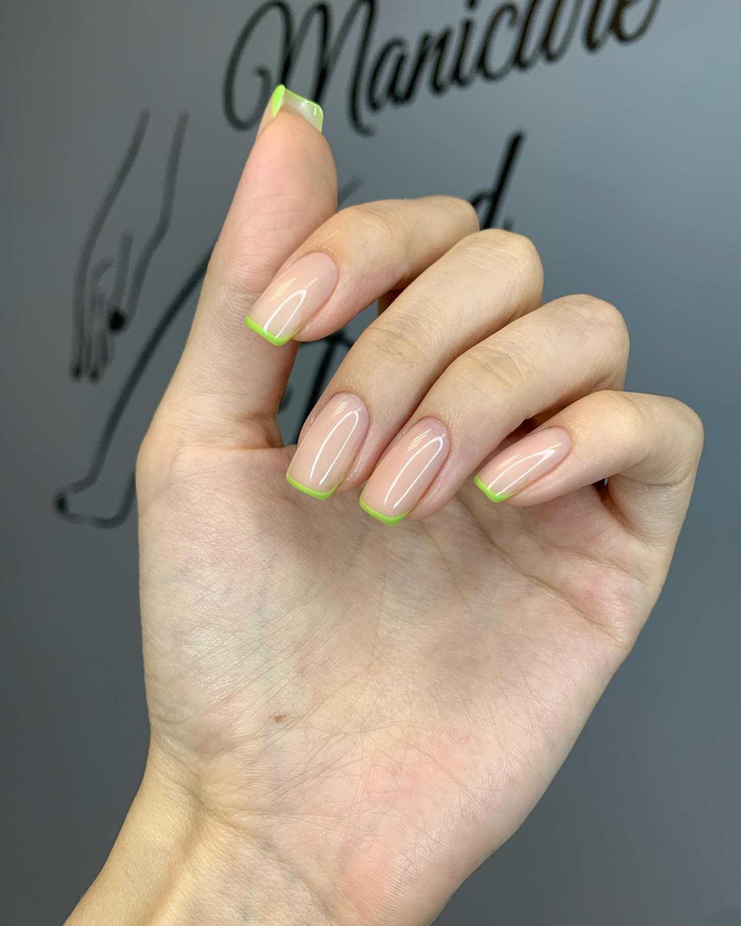 Мода последних сезонов в нейл арте — цветной французский маникюр. Улыбка может быть самых разных оттенков — ярких неоновых, черных, синих и зеленых. Ограничений нет. Еще один смелый вариант — сделать каемки на обеих руках разными. Для этой цели выбирают контрастные цвета лака или близкие.