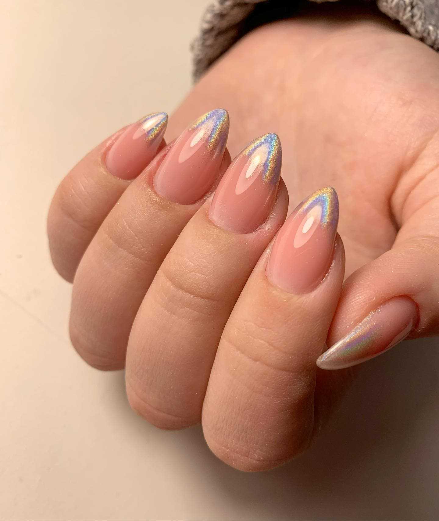 Блестящие текстуры актуальны в любом сезоне, однако в летних образах такой декор смотрится особенно красиво. Френч миллениум представляет собой дизайн, где край ногтевой пластины выделен не цветным гель-лаком, а прозрачным лаком с серебряным, золотым или медным глиттером.