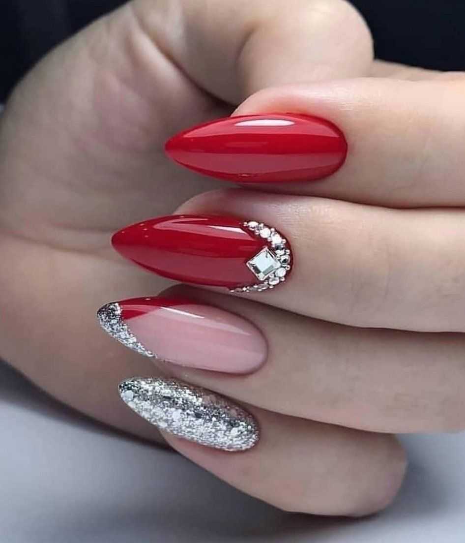 Для новогодней ночи можно позволить себе чуть больше блеска. Поэтому в данном случае блестящий маникюр будет как никогда кстати. Смело делайте такое оформление даже в домашних условиях.
