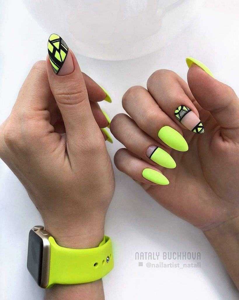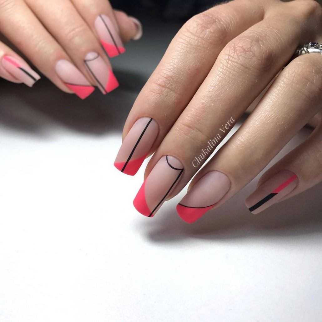 Не смотря на то, что этот дизайн универсален, практичен и нейтрален, он сейчас менее популярен. Да классический френч подходит и под короткую юбку и под вечернее платье и сложно найти более удобный формат, но сейчас на пике популярности нео яркий френч который создается из смеси нескольких техник и обыгрывается абстрактными узорами.
