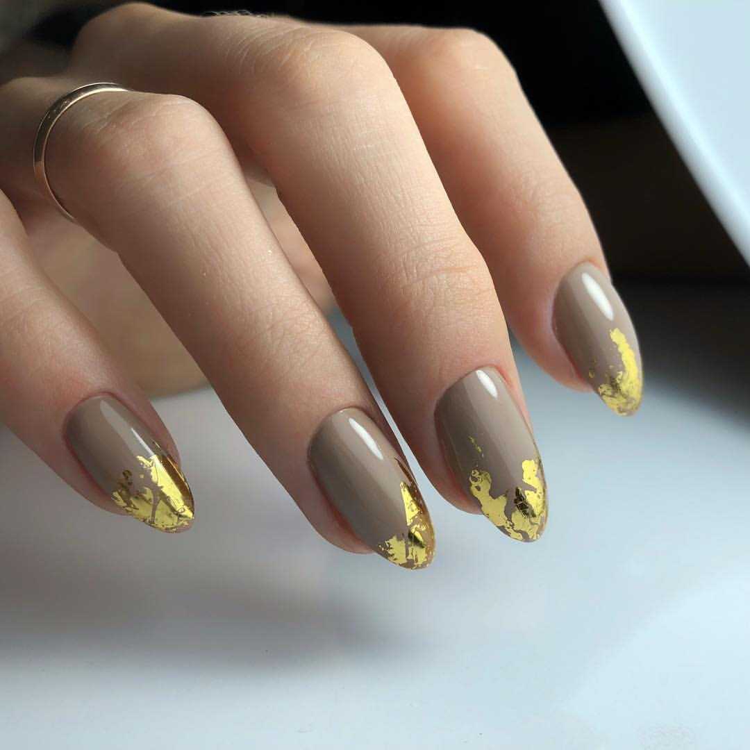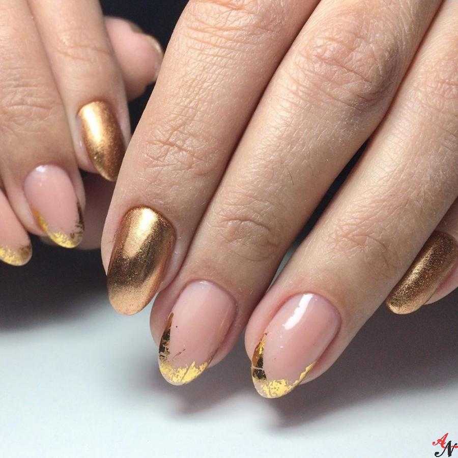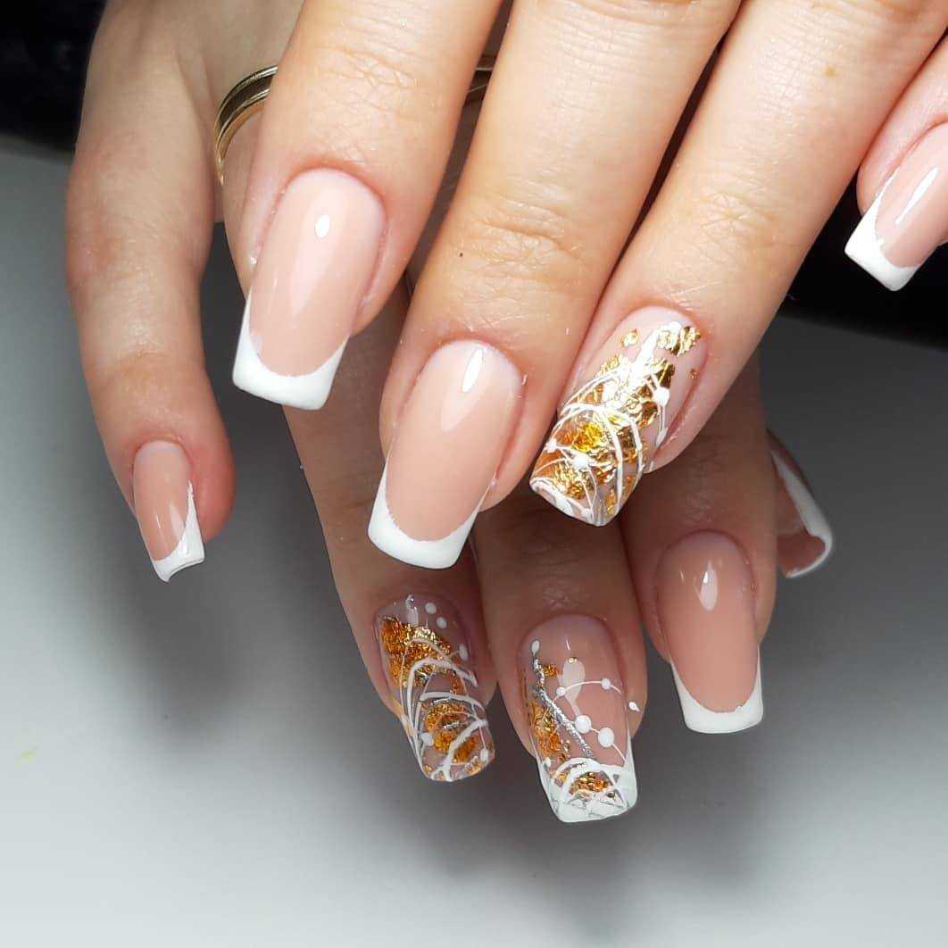 Фольгированные хлопья или листовой материал — хорошее решение, если делаете маникюр самостоятельно. Здесь не нужно соблюдать четких границ. Чем уникальнее получится французский дизайн с фольгой, тем лучше.