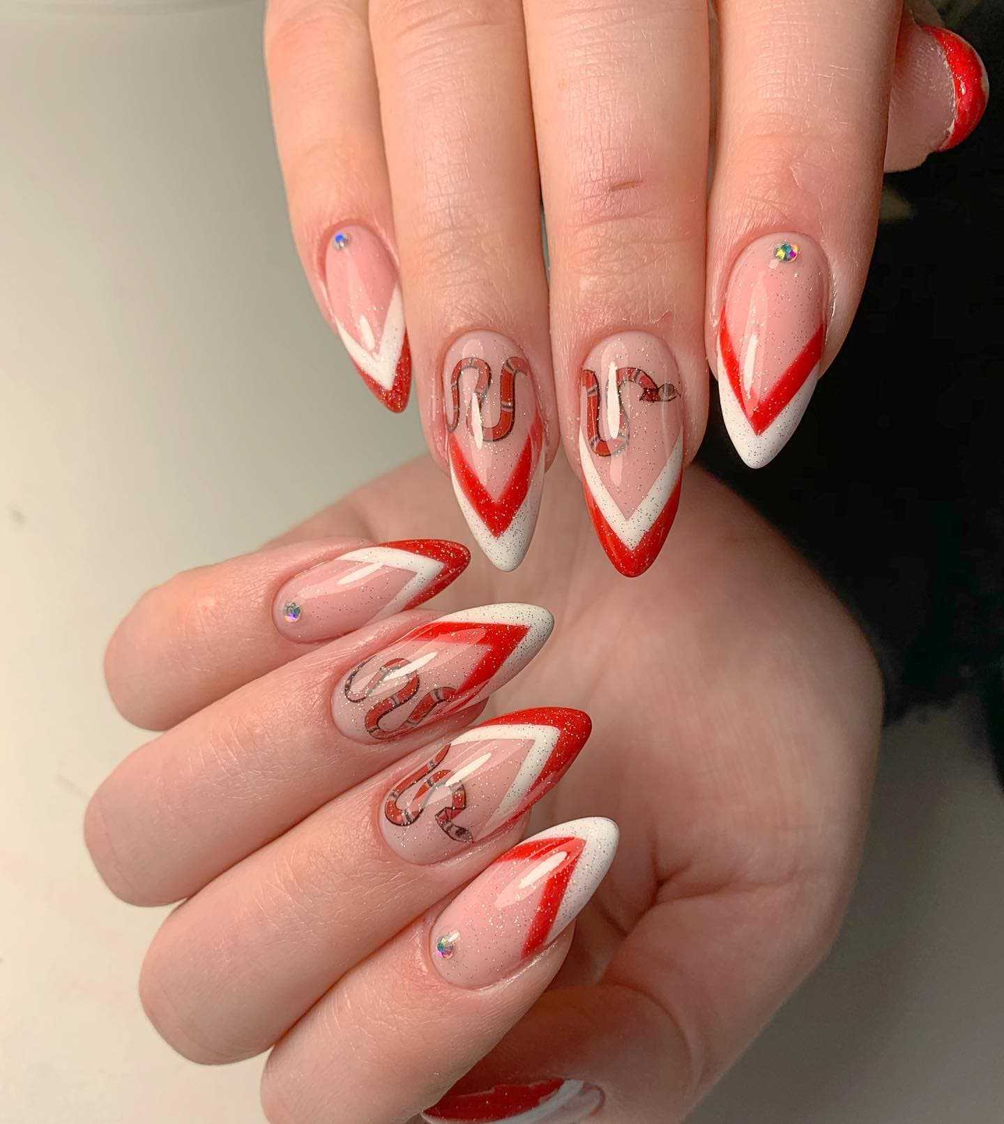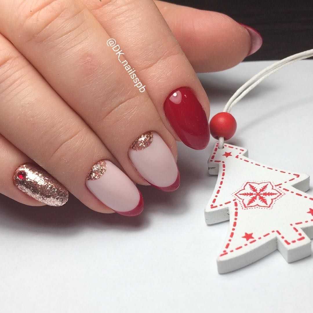 А можно ли красный сделать еще сочнее? И можно, и нужно! Для этого зимний дизайн ногтей предполагает острую ноту из золотых звезд. Это – актуально, колоритно и броско! Красный цвет завоюет лидирующие позиции: и во французском, и в лунном он сыграет свою роль.