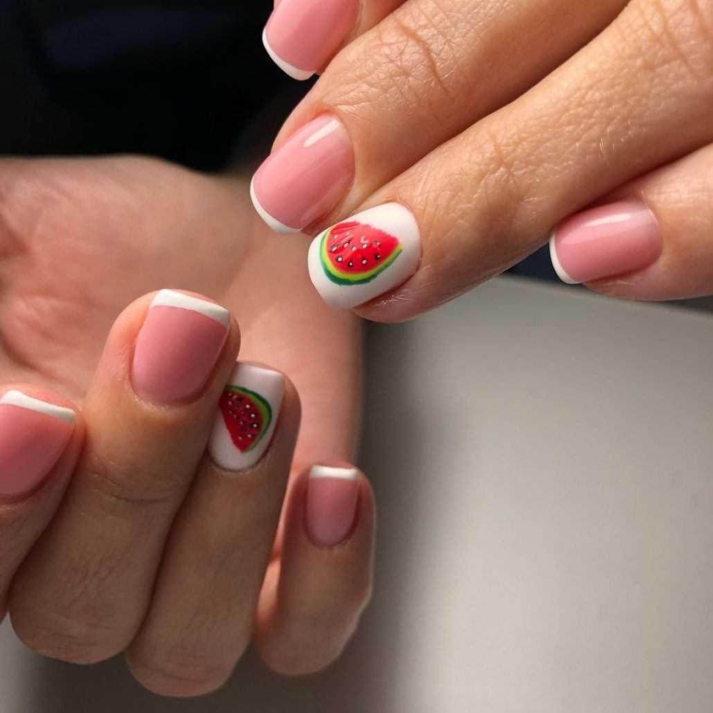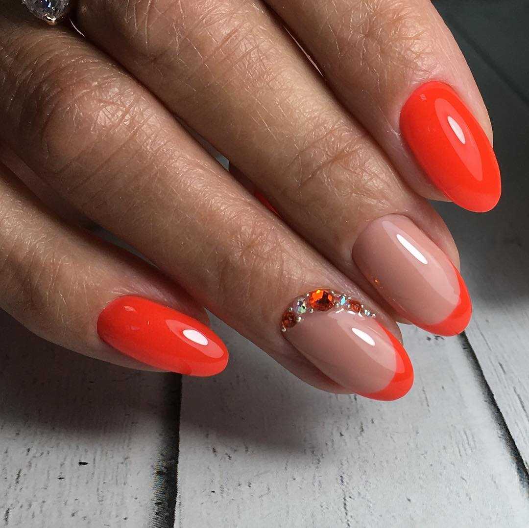 Какой френч впишется в любой образ и будет выглядеть ярко? Конечно, маникюр с оранжевым акцентом. Используй правильные инструменты для творчества — тонкую кисточку или зубочистку. Сначала изобрази маленький круг, а потом добавь к нему две зеленые черточки в качестве листьев — в яблочко. В конце поставь в середину белую точку, имитируя натуральный блик.