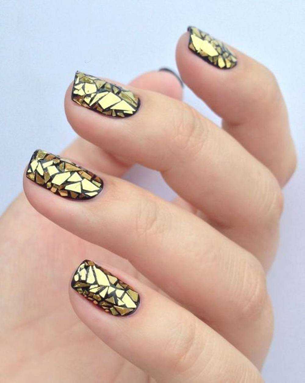 Все прекрасно знают, как хорош черно-золотой маникюр на ногтях. Дополнительные украшения в золотом стиле вроде пирсинга ногтевой пластины так же достойно выглядят.