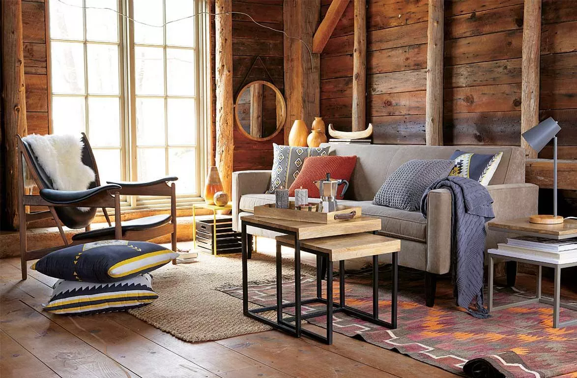 Чтобы придать рустику современный вид, достаточно избавиться от нарочито деревенских предметов интерьера и привнести текстиль с использованием плюша или искусственного меха, также интересную гармонию он создает с канделябрами и вазами из вышеупомянутого «тяжелого люкса».